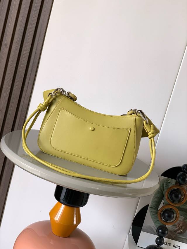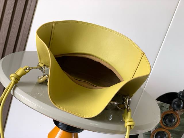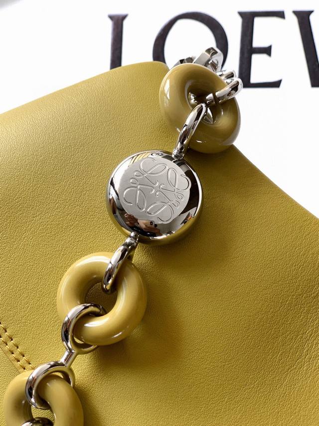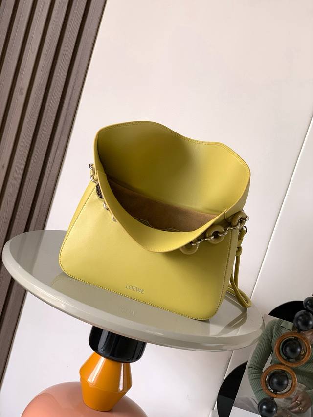 Medium Smooth Calfskin Ola Handbag. The Ola is a soft, lightweight, and versatile summer handbag featuring a curved body, a sleek flap, and a striking donut chain. This medium version is crafted from smooth calfskin leather. *Detachable calfskin tubular shoulder strap. *Detachable donut chain. *Flap closure. *One interior pocket. L0Ewe gold foil stamping, engraved Anagram logo. Dimensions: 26cm