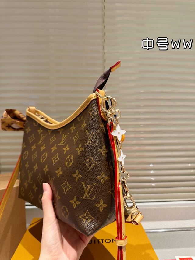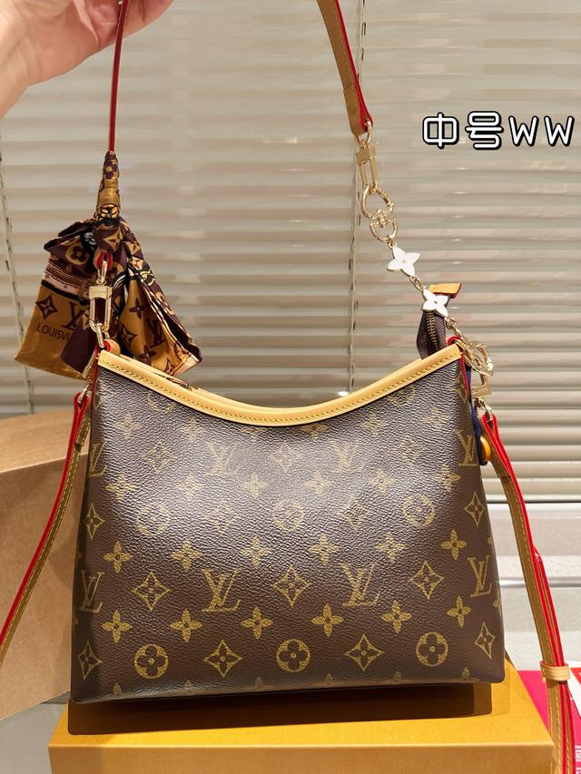 Medium-sized Louis Vuitton Hobo Bag (leather version), a classic moon bag, slightly larger than a shoulder bag. Size: 25 cm.