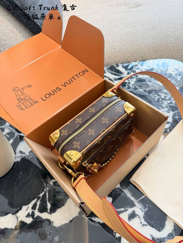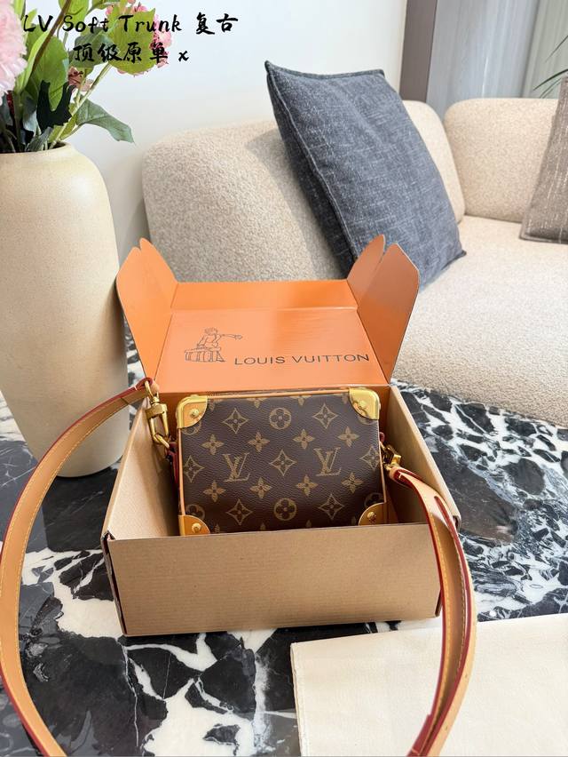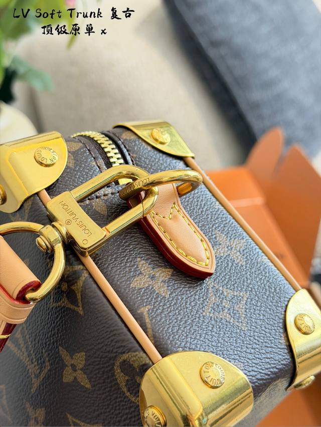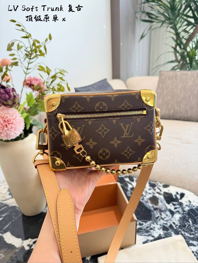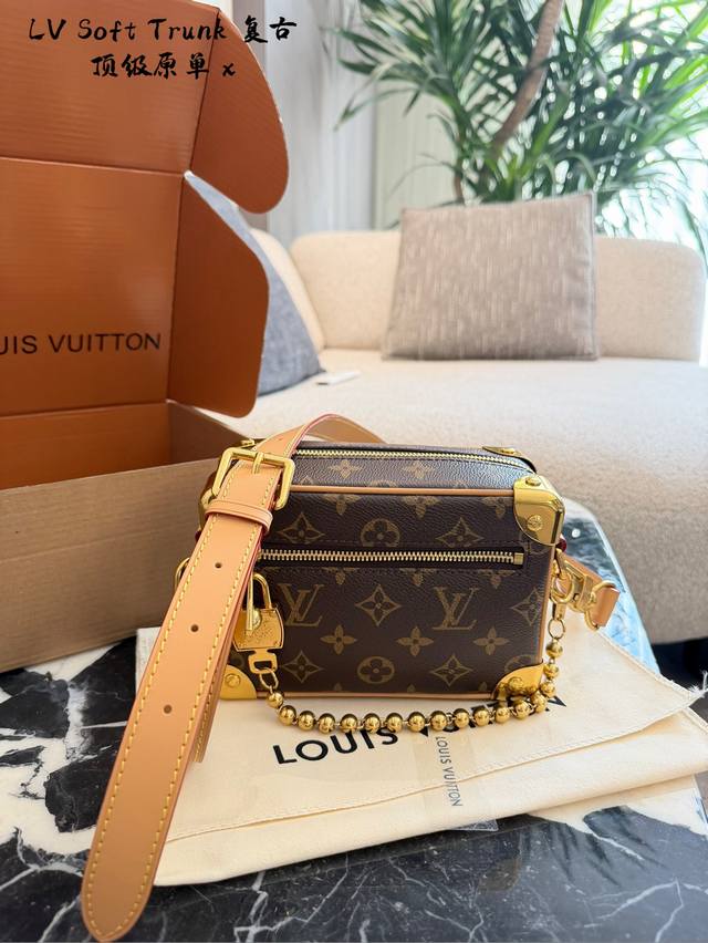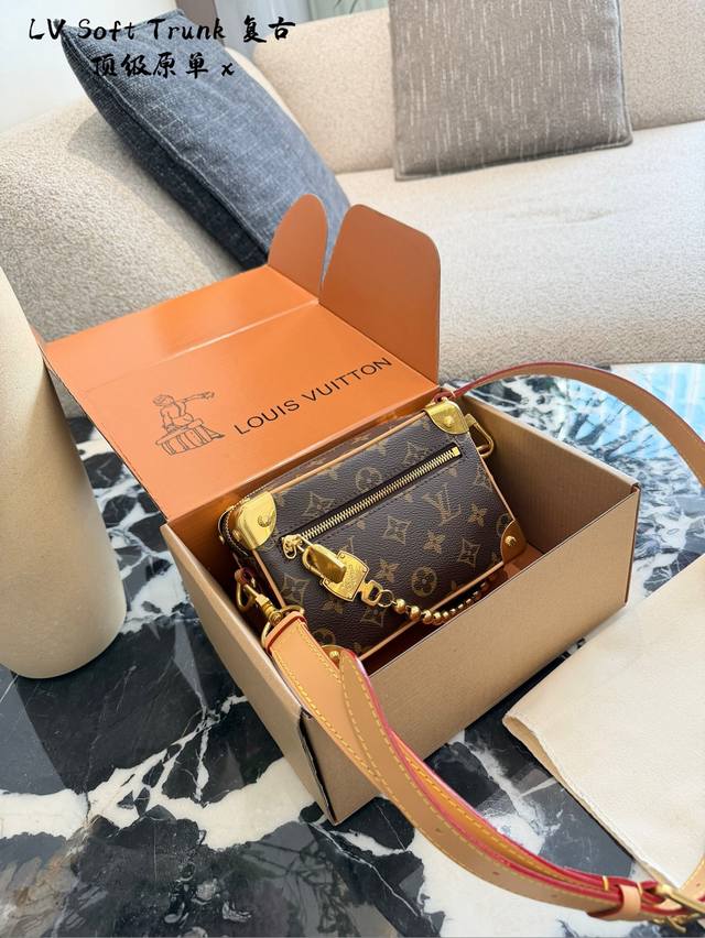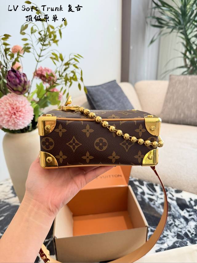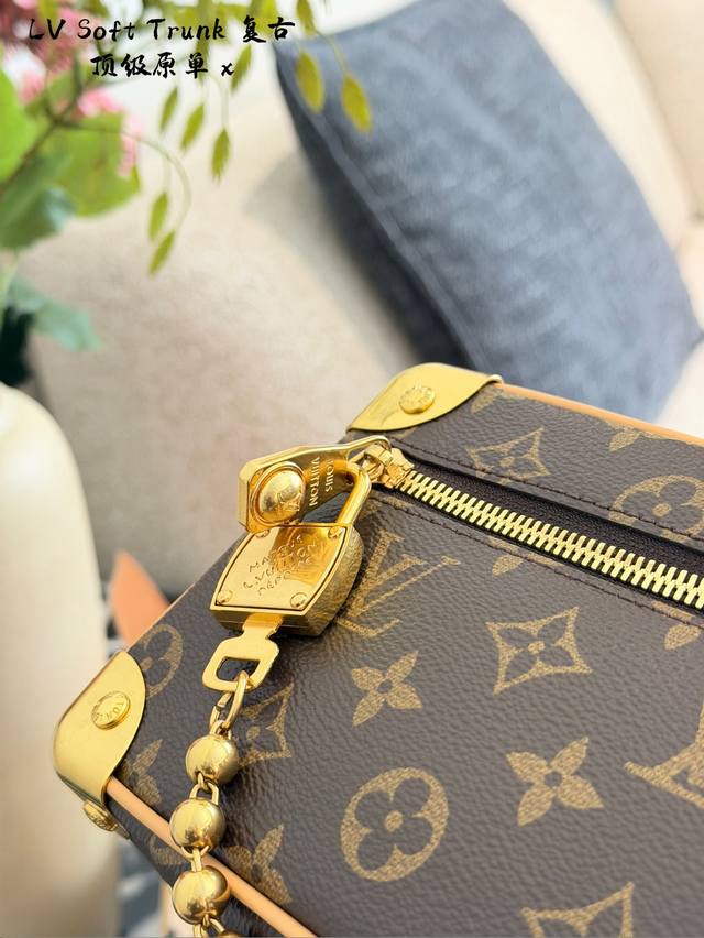 This mini soft trunk is made of Monogram coated canvas with natural cowhide trim. It features a gold ball chain and a new decorative padlock engraved with the "Louis Vuitton Marque D