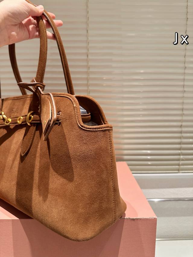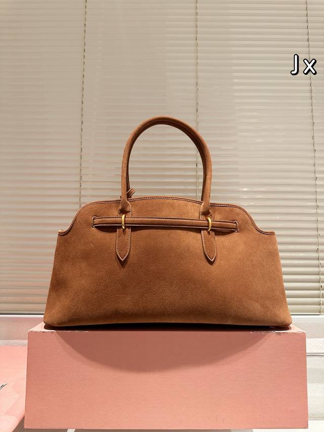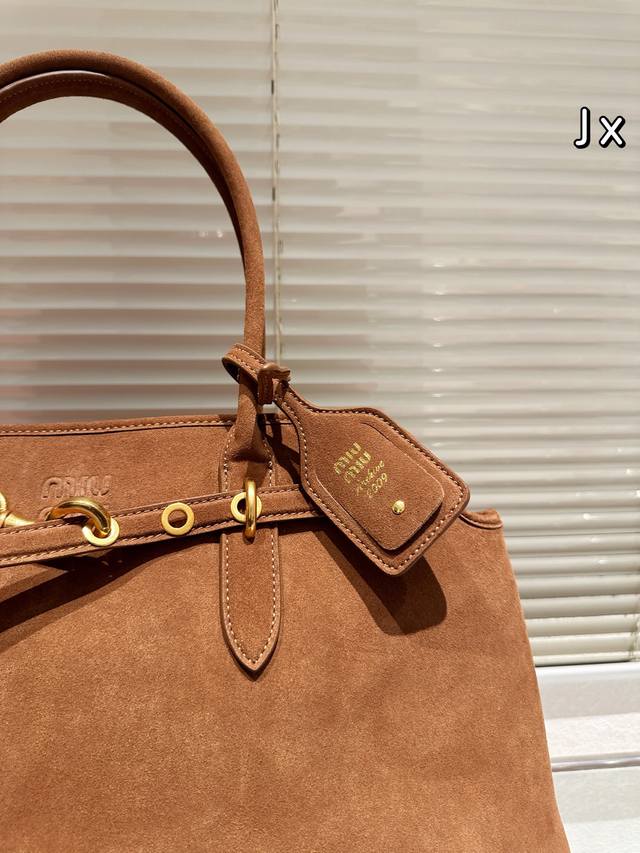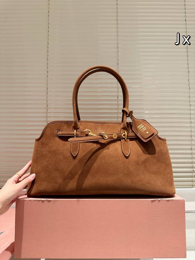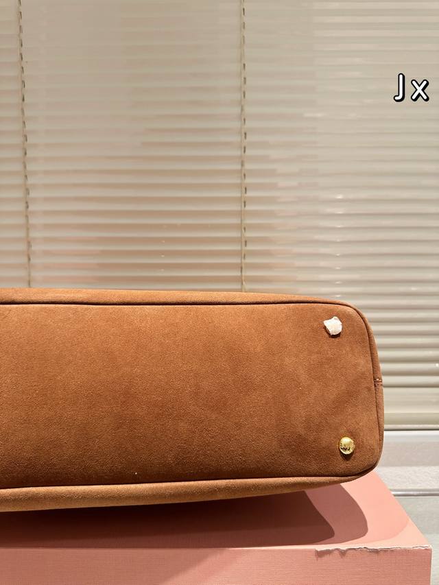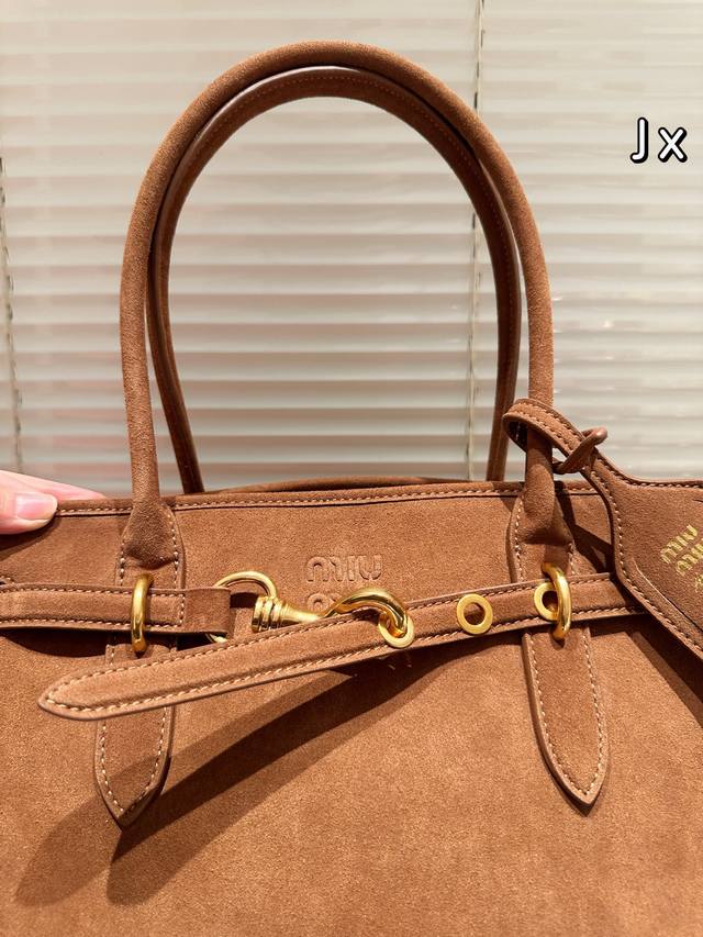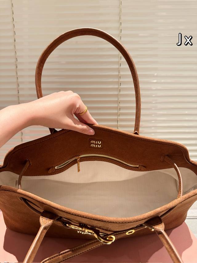 Miu Miu Aventure Horizontal Tote Bag. Made of premium Nappa lambskin, soft and supple, with an understated elegance in oak. Measuring 22.5 x 44 x 14.5 cm, it boasts a large capacity, making it incredibly practical for commuting and everyday use. Features double handles and metal clasps, exuding a vintage charm. The spacious interior can hold a laptop, folders, and more. The Aventure series emphasizes both practicality and style, a classic Miu Miu design, perfect for those who appreciate quality and functionality.