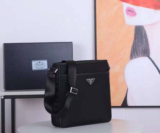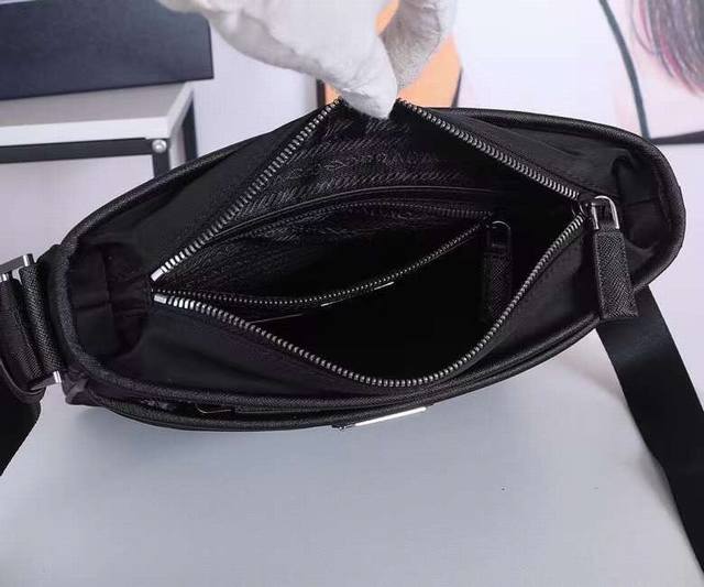 Model 2Vh797! New nylon crossbody bag, same as the official website and boutique, top-tier boutique quality, made with imported Korean parachute fabric, extremely waterproof; original nylon lining, original hardware, polished steel fittings and black genuine titanium zippers; pure copper electroplated triangular logo; two zippered outer pockets, one on the front and one on the back; a main zippered compartment and an inner zippered pocket, comparable to boutique quality. Dimensions: L. 27.0 H. 25.5 W. 6.0 Cm