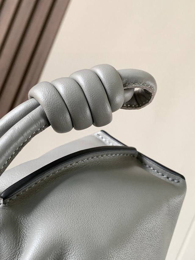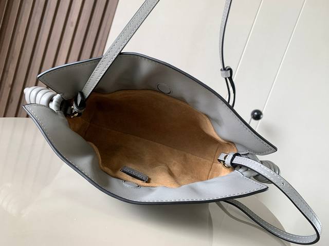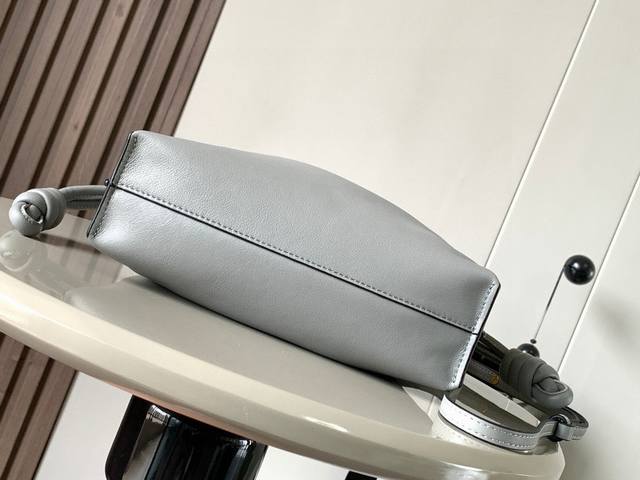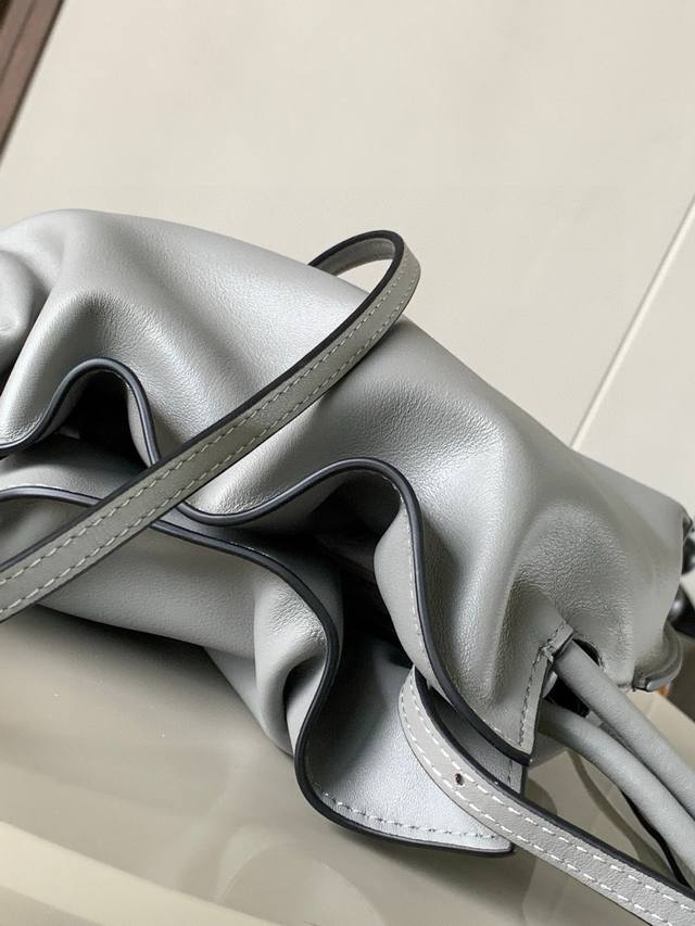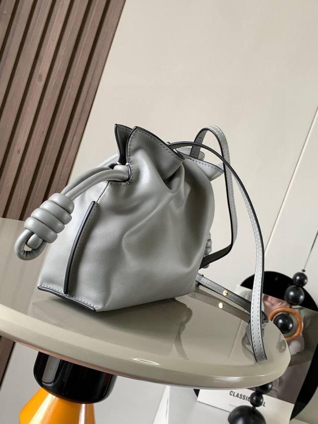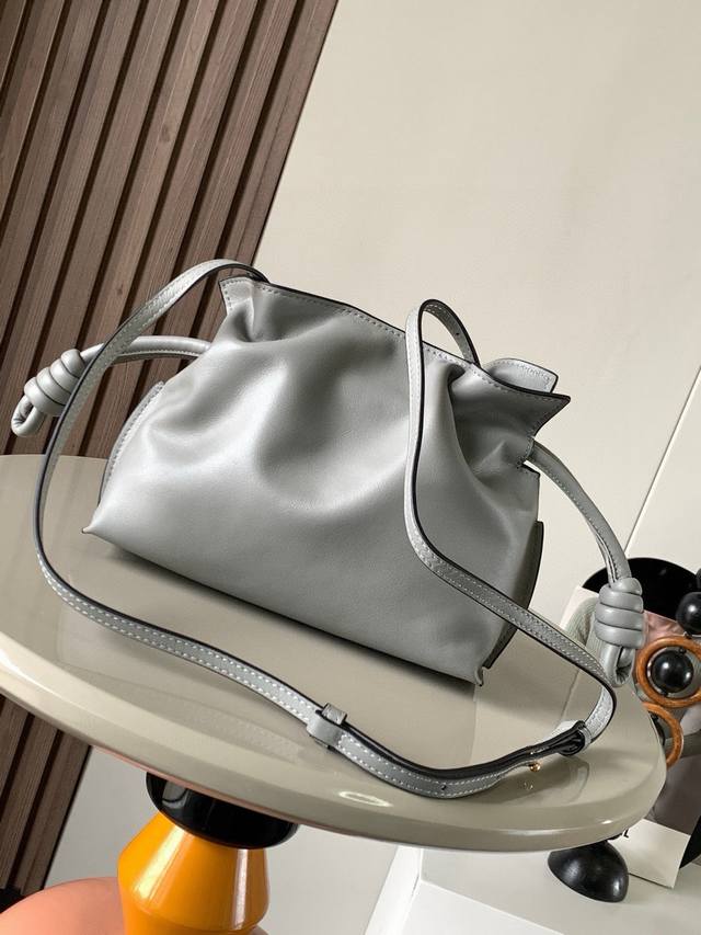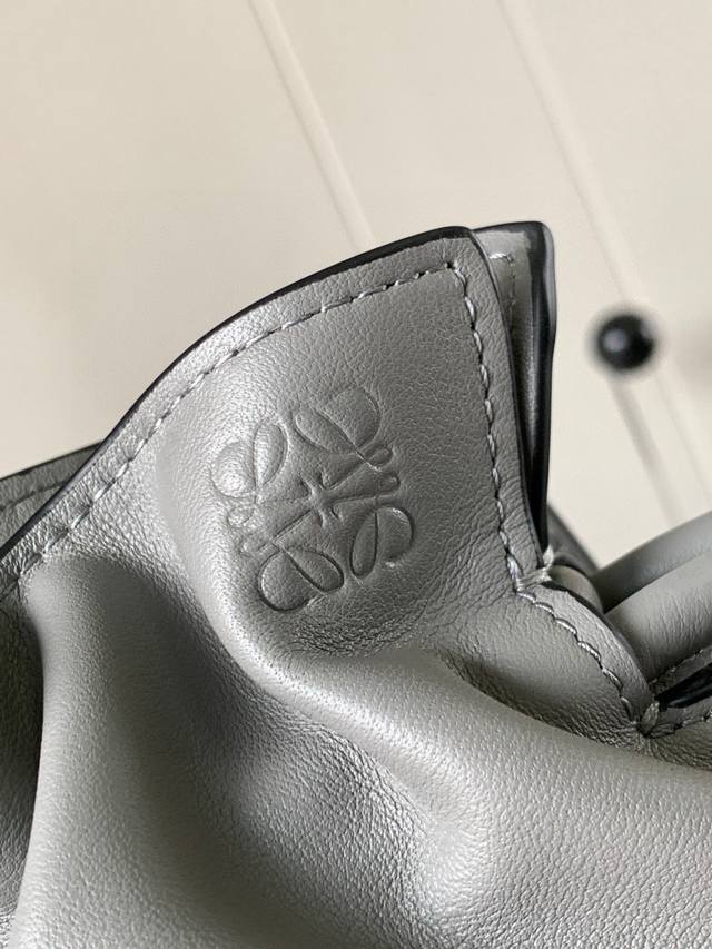 National Day Special Offer Mini 23cm New Nappa Calf Leather Flamenco Handbag. This lucky bag features a drawstring closure and a signature coiled knot. Made from Nappa calf leather, this version perfectly showcases the softness and practicality of leather in the Flamenco Knot. It's safe to say that whatever you're looking for, you can find it in the Flamenco Knot. It perfectly combines the drawstring bag and tote bag, giving women a unique feel. While it looks incredibly simple, it's also very special, exuding a casual yet stylish vibe. The bag's name is the same as the flamenco dance of the Spanish Gypsies, which perfectly represents Loewe's casual, elegant, and individualistic design style. The leather is smooth Spanish calfskin, exceptionally soft to the touch, with a sturdy and scratch-resistant suede lining. Highly featured in street style photos, it can be used as a shoulder bag or a tote bag. The distinctive drawstring design and soft leather construction, when tightened, create a smoother silhouette, making it suitable for both work and leisure. Size: 23cm~18cm~9cm Style Number: 9036 Color: Asphalt Grey