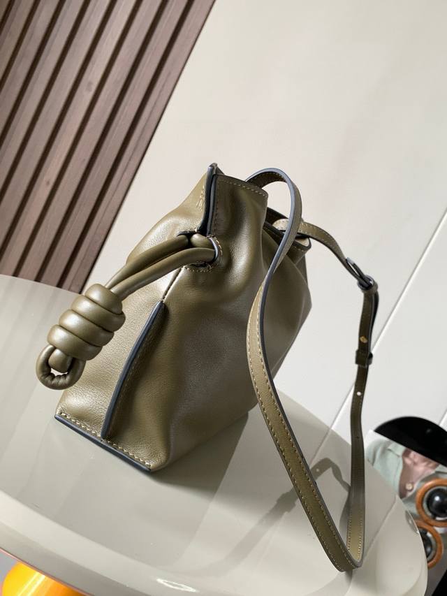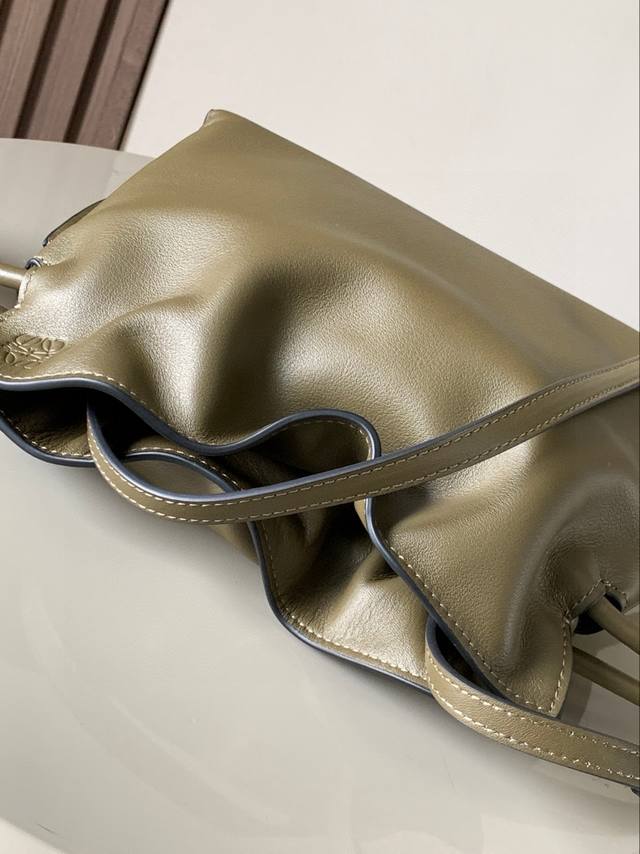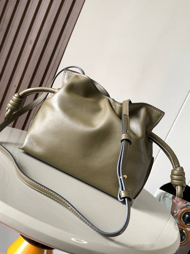 National Day Special Offer Mini 23cm New Nappa Calf Leather Flamenco Handbag. This lucky bag features a drawstring closure and a signature coiled knot. Made from Nappa calf leather, this version perfectly showcases the softness of leather and practicality in the Flamenco Knot. It's safe to say that whatever you want to look for, you can find it in the Flamenco Knot. It perfectly combines a drawstring bag and a tote bag, giving women a unique feel. Although it looks incredibly simple, it's also very special, exuding a casual yet stylish vibe. The bag's name is the same as the flamenco dance of the Spanish Gypsies, which perfectly represents Loewe's casual, elegant, and individualistic design style. The leather is smooth Spanish calfskin, with a particularly soft feel. The suede leather lining is sturdy and scratch-resistant. Highly featured in street style photos, it can be used as a shoulder bag or a tote bag. The distinctive drawstring design and soft leather construction, when tightened, create a smoother silhouette, making it suitable for both work and leisure. Size: 23cm~18cm~9cm Style Number: 9036 Color: Khaki Green