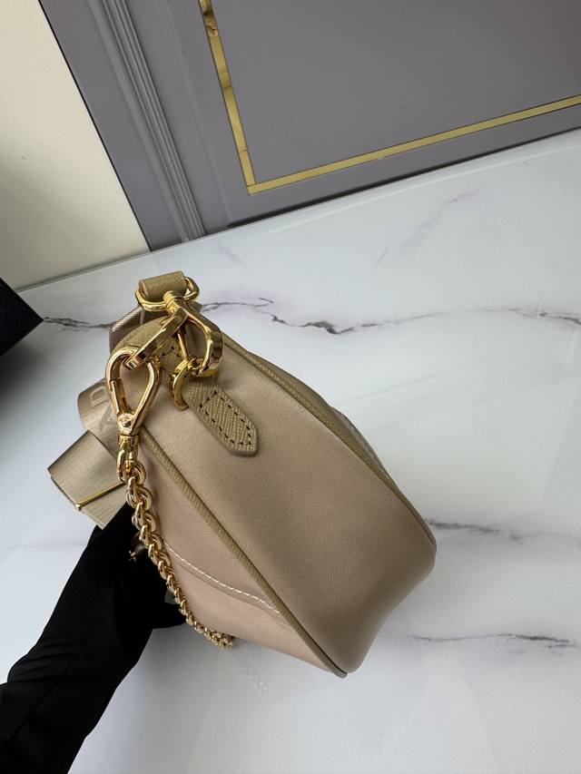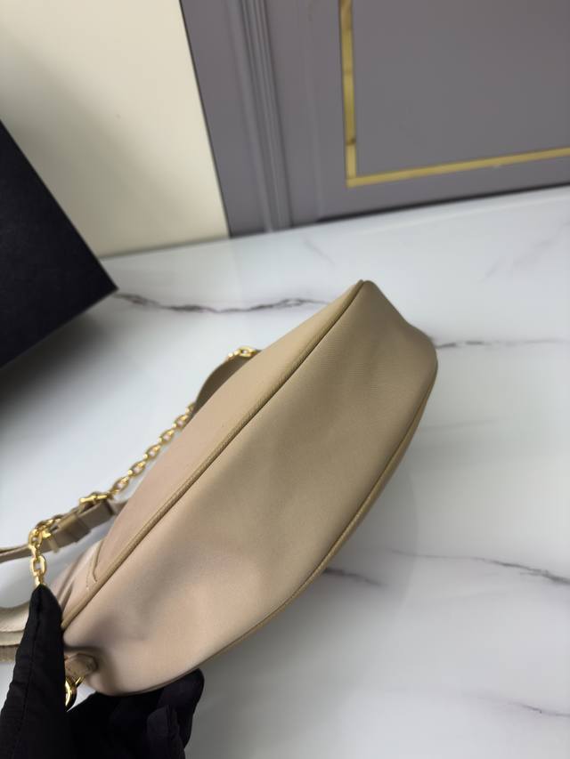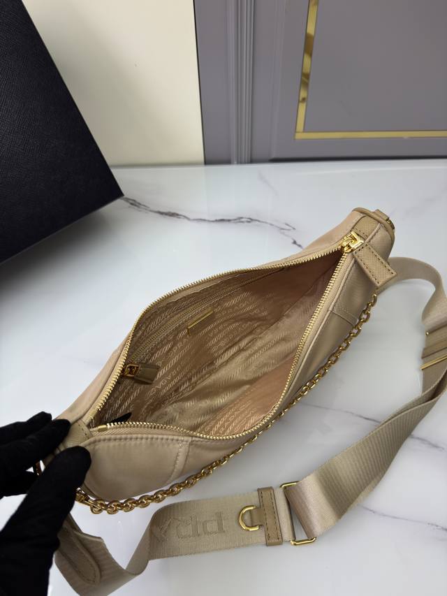 This Re-Nylon handbag is made from recycled nylon fabric, exquisite and versatile, blending an archive silhouette with practical contemporary style. The crescent shape, combined with a detachable sporty shoulder strap and elegant chain handle, offers multiple carrying options. Wear it crossbody, underarm, or carry it by hand