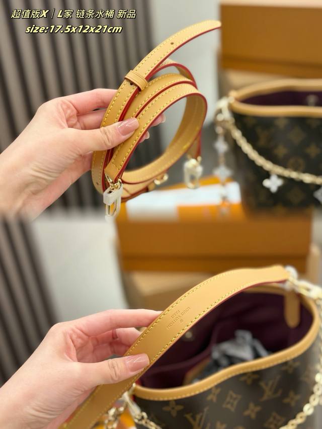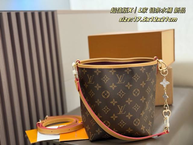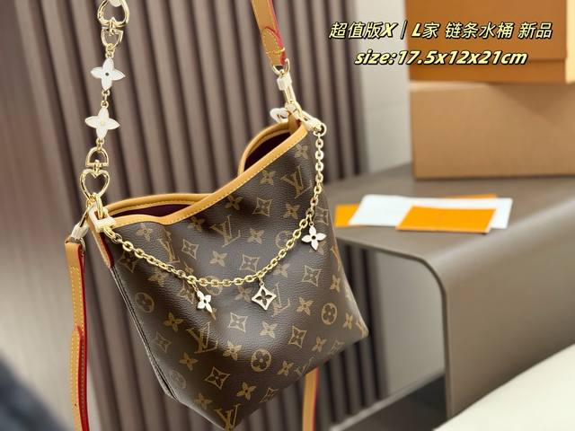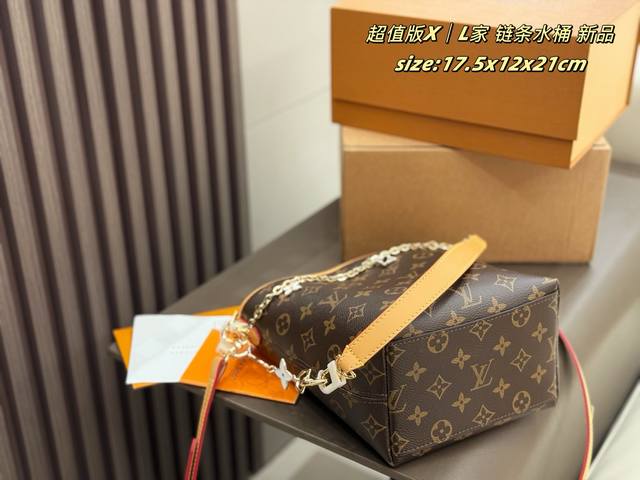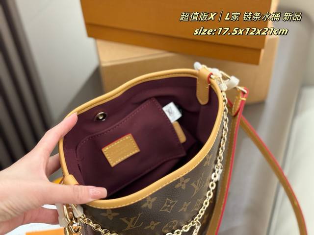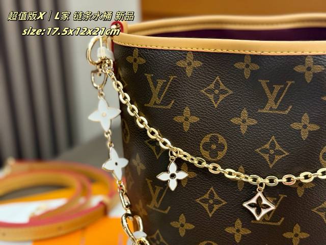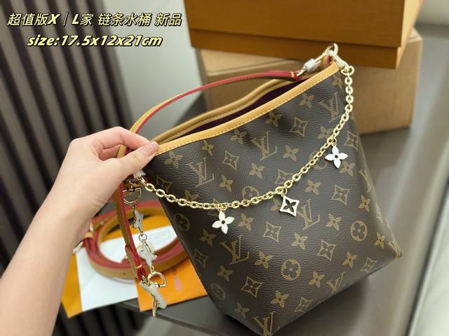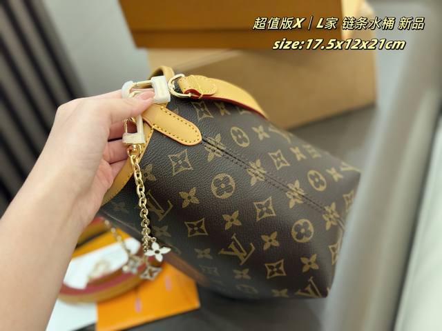 New Double-Box Packaging Louis Vuitton Chain Bucket - Perfectly Proportioned for the Body! 1. Can be carried on the shoulder or by hand. 2. Capacity meets the needs of many daily scenarios, including commuting and short trips. It holds a lot of things, and the price is quite reasonable. The size is also just right, not too big or too small. Suitable for both tall and short people. 3. A must-have for autumn and winter, especially with coats and dark colors. Also suitable for spring and autumn. 4. The color is dirt-resistant. 5. Can be randomly paired with small accessories to create various styles. Size: 17.5X12X21Cm