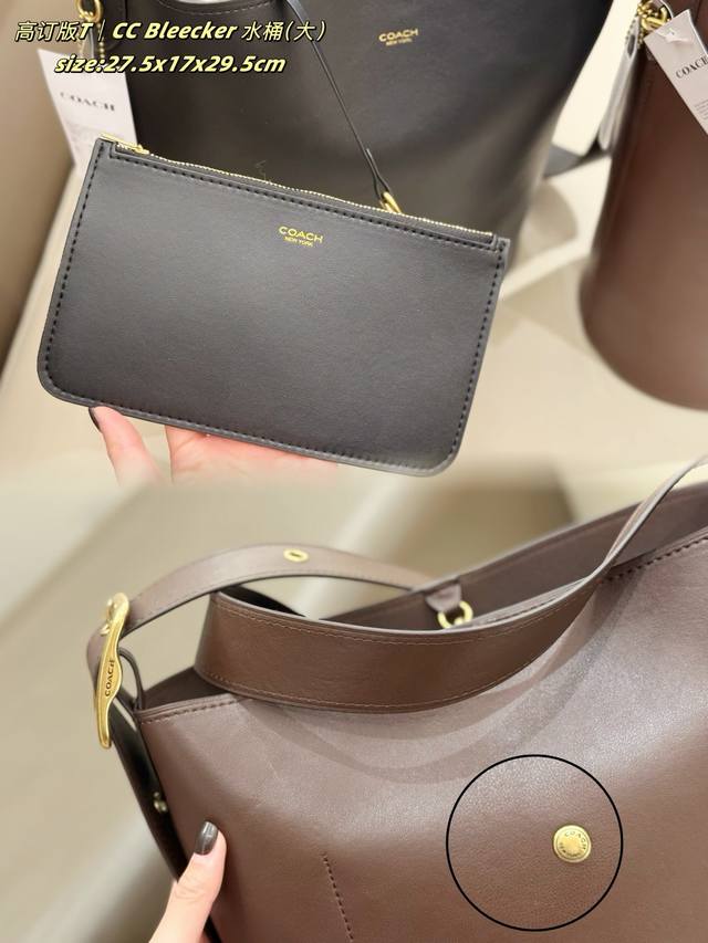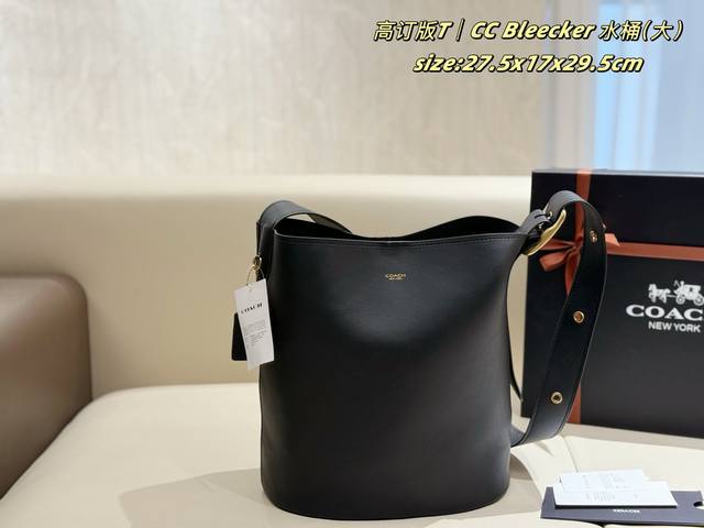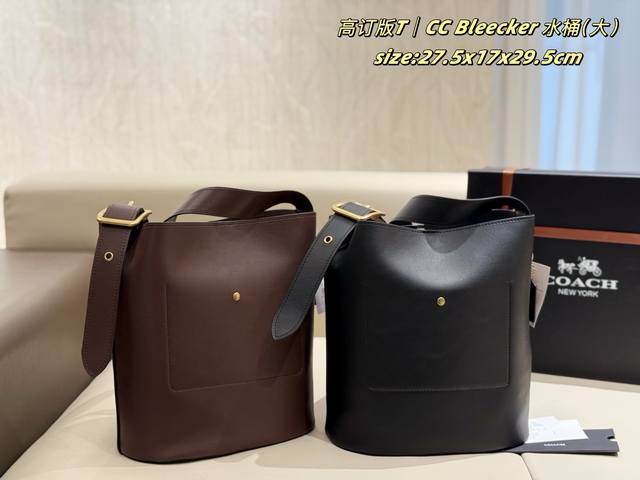 New large size Coach Bleecker bucket bag with gift box. It's very spacious, holding all your everyday essentials. Easy to style and photogenic, it effortlessly exudes sophistication. The "lazy silhouette" is crafted from supple cowhide that drapes naturally, swaying lightly with your steps for effortless chic. The adjustable shoulder strap allows for versatile carrying options, seamlessly switching between underarm and crossbody styles, perfect for commuting or dates. Size: 27.5 x 17 x 29.5 cm.