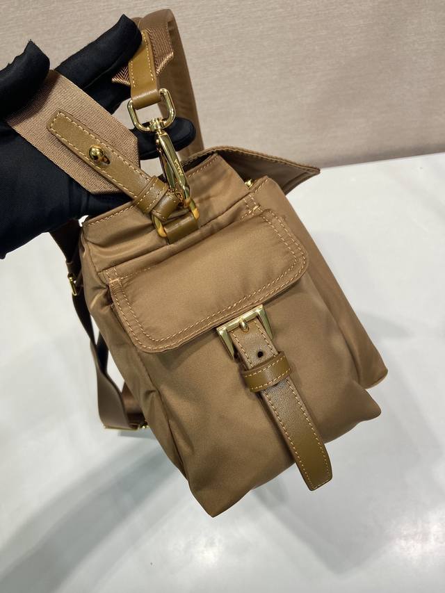 This handbag perfectly blends sophistication and functionality. Made from recycled nylon, it features a soft silhouette and multiple pockets. The lightweight and practical design combines sporty and versatile elements, adorned with an enamel triangular metal logo and leather details. It comes with two detachable shoulder straps, is spacious, and is simply perfect. Another timeless and popular style, the large size is unisex. Grab yours now! 9