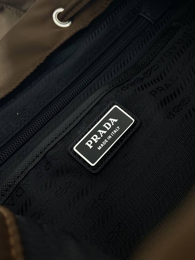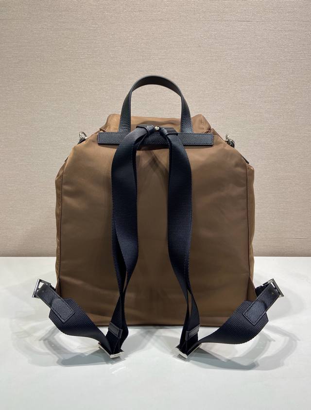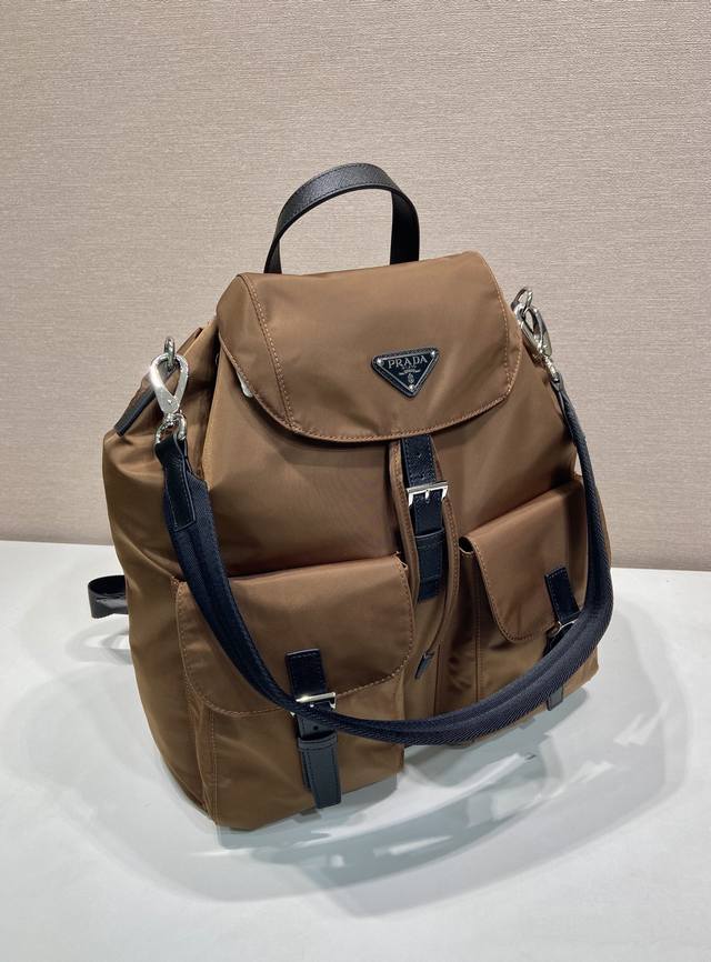 New Re-Nylon Backpack 2Vz110A, Gold/Brown Color. This Re-Nylon backpack features classic nylon fabric, top-quality hardware, and innovative yet practical elements, presenting a refined and timeless style. It comes with a detachable shoulder strap, making it versatile for different occasions. It looks very stylish and sophisticated, another timeless and popular item