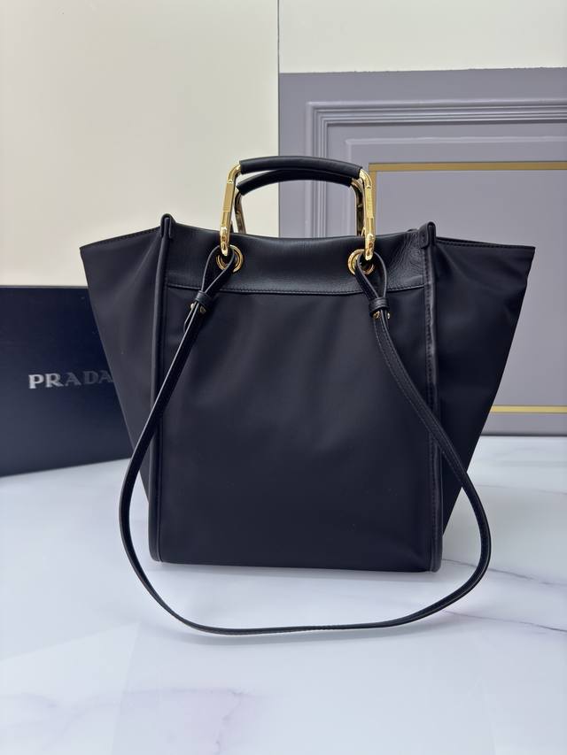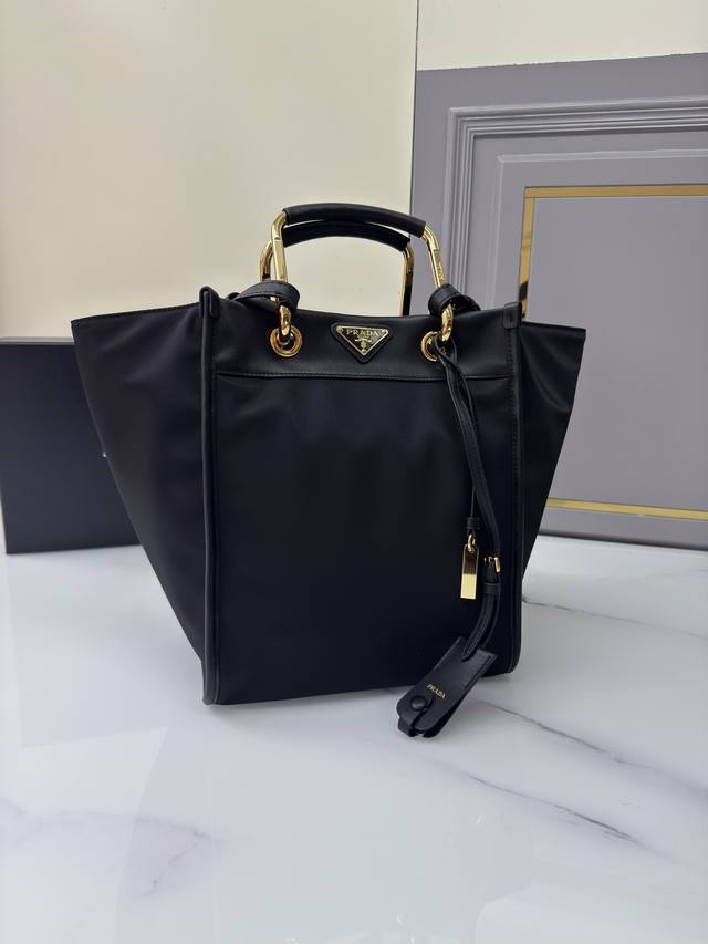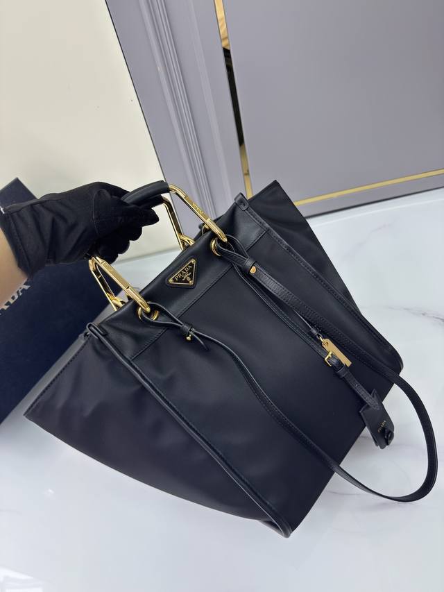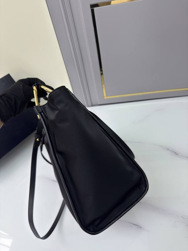 This tote bag features a stylish geometric shape, combining practical Re-Nylon recycled nylon with exquisite details. Versatile in style, it comes with metal and leather handles, easily switching between a handbag and a shoulder bag. Adorned with the iconic enamel triangular metal logo. Large capacity, and a timeless must-have for everyone! Grab yours now! Length 23cm x Height 28.5cm x Base 15cm