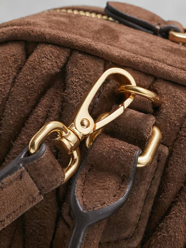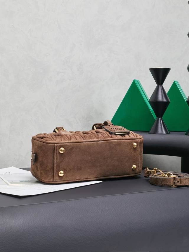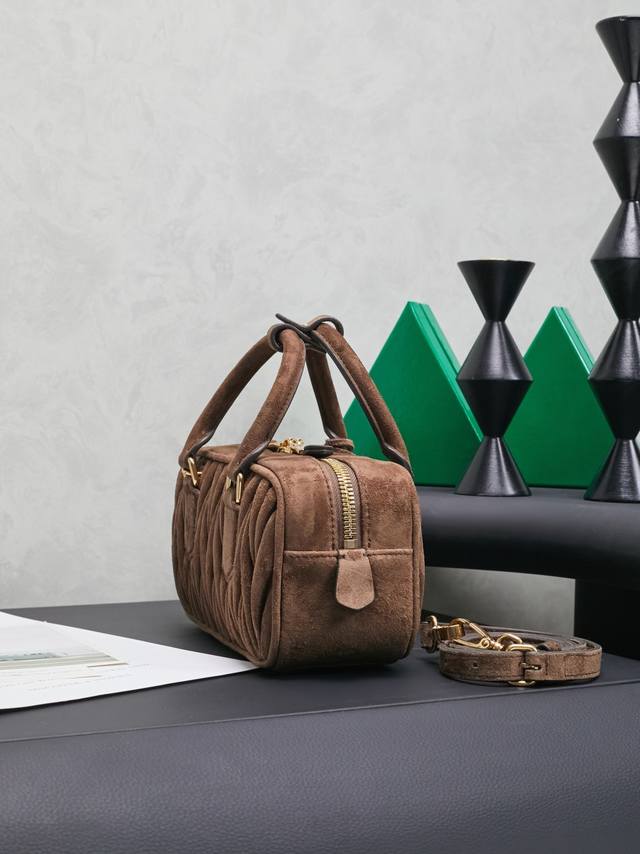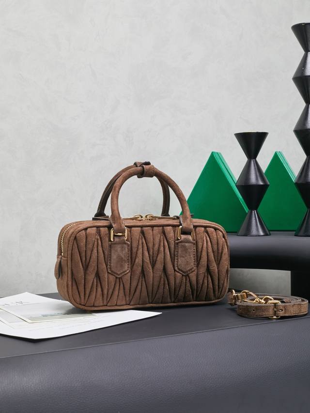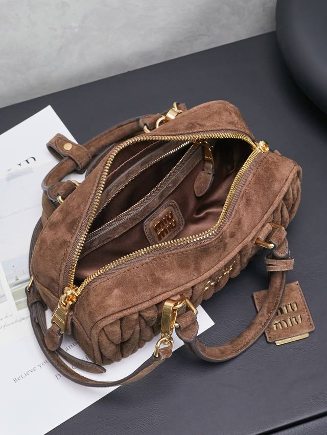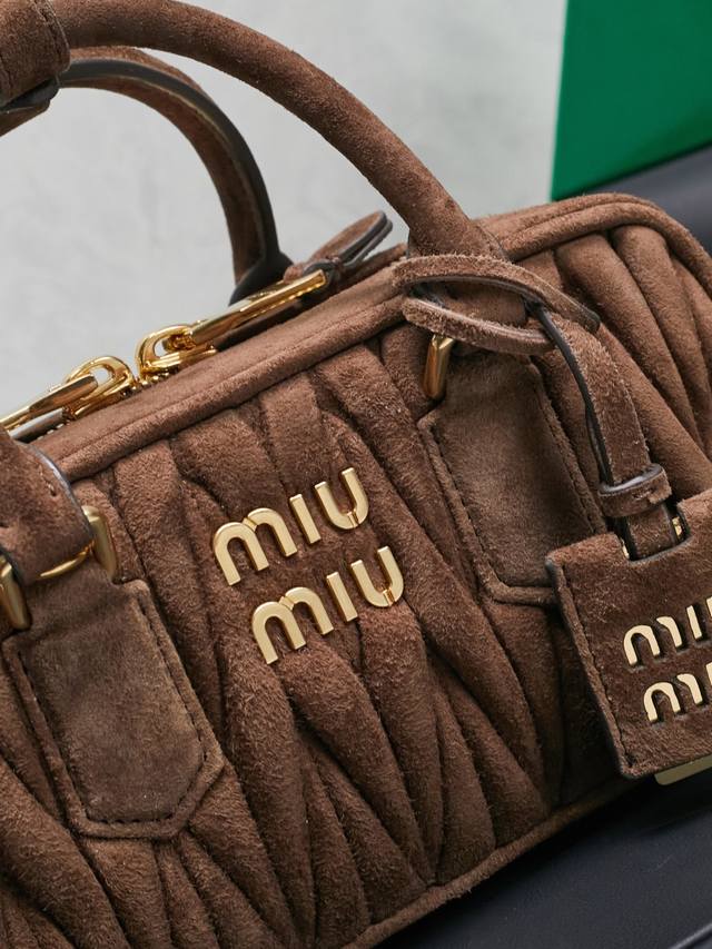 New Version: 5Bb142, Miu Miu's new bowling bag, a top pick on the official website, an absolute must-have style this year, made of top-quality imported lambskin, featuring Miu Miu's signature Matelasse pattern, exquisite and structured design, with an engraved logo on the front that complements the leather color, a detachable and adjustable leather shoulder strap, cotton satin lining, and a zippered pocket. A favorite among many celebrities and influencers, dimensions 22 x 10.5 x 7.5 cm, comes with original packaging.
