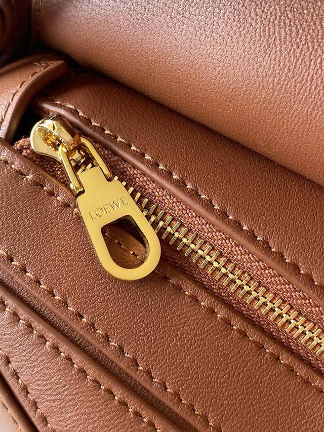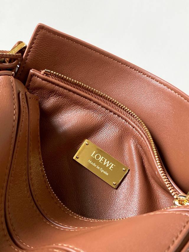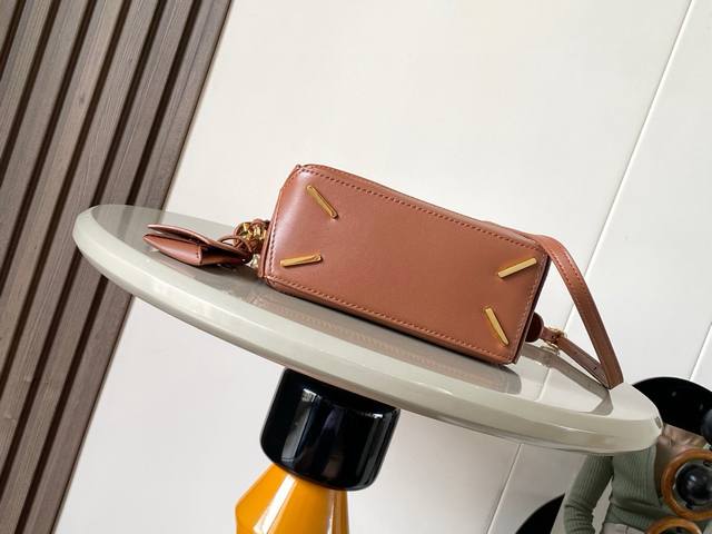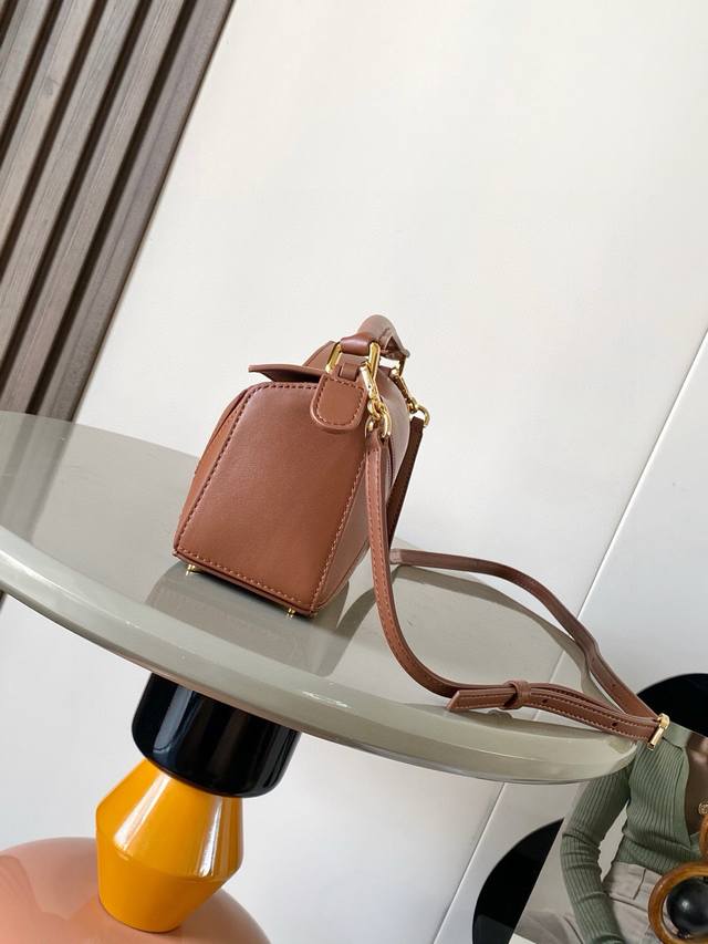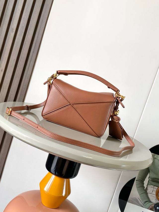New version of the geometric mini Nappa lambskin Featherlight Puzzle handbag. Made from original imported Nappa calfskin, the bag features a unique geometric silhouette with rectangular lines. The soft, lightweight Nappa leather gives the bag a relaxed, effortless style. *Can be worn on the shoulder, crossbody, or carried by hand.* Detachable and adjustable shoulder strap with a rotating clasp.* Zipper closure with hinged zipper pull.* One external zippered back pocket, one internal slip pocket.* Detachable, featuring a concealed pocket and balloon dice.* Rectangular metal feet.* This smaller version is made from soft Nappa calfskin.* The small Puzzle can hold, for example, a large wallet, all sizes of mobile phones, and sunglasses. Can be carried crossbody, shoulder, by hand, or with the top handle.* Detachable handle.* Color: Brown.* Style Number: 9098.* Size: 18cm
