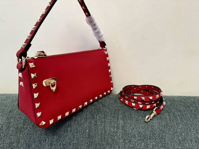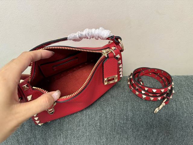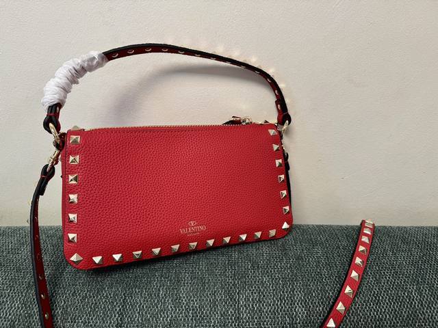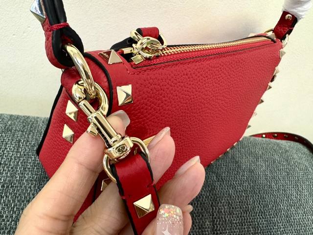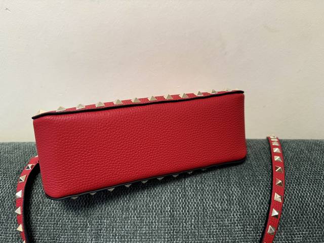 Valentino Garavani Rockstud Small Grained Calfskin Crossbody Bag, the iconic hook-and-loop closure has been reinterpreted, with a metal finish on the zipper pull, rivets, and hardware. Double closure: zipper and hook-and-loop, adjustable, detachable shoulder strap