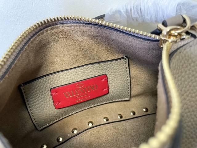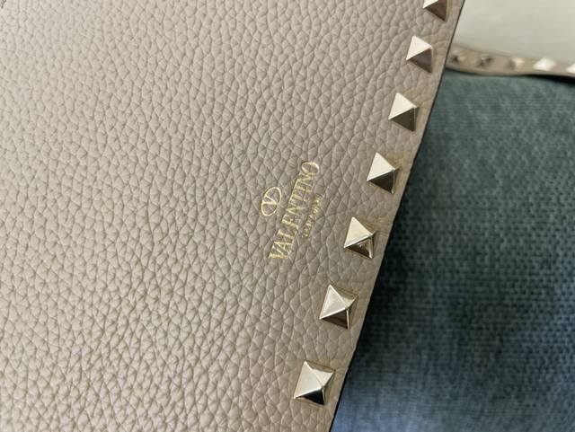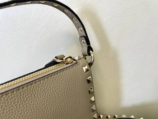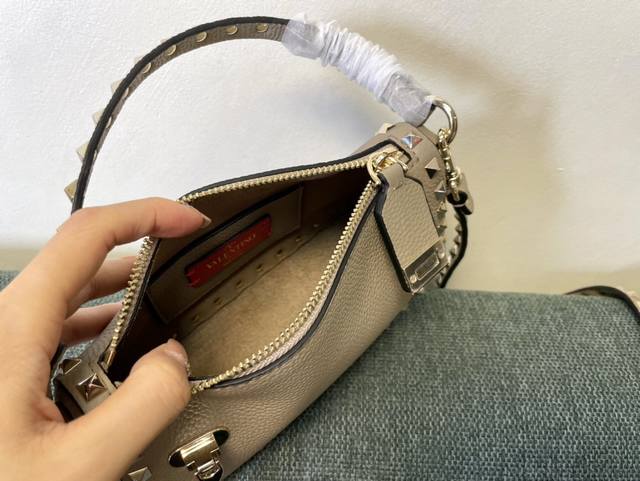 Valentino Garavani Rockstud Small Grained Calfskin Crossbody Bag, the iconic hook-and-loop closure has been reinterpreted, with a metal finish on the zipper pull, rivets, and hardware. Double closure: zipper and hook-and-loop, adjustable, detachable shoulder strap