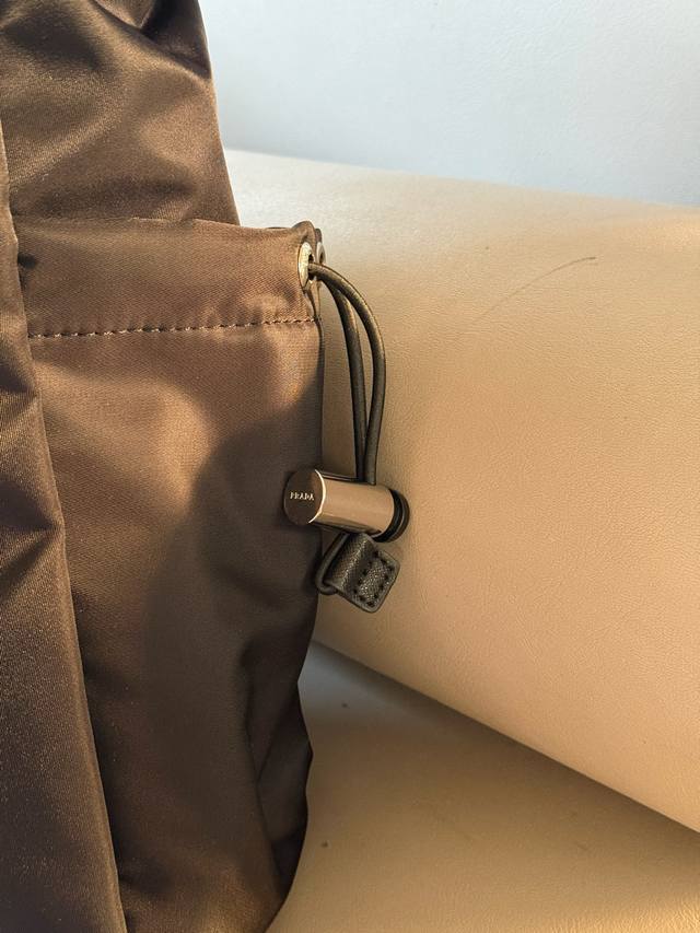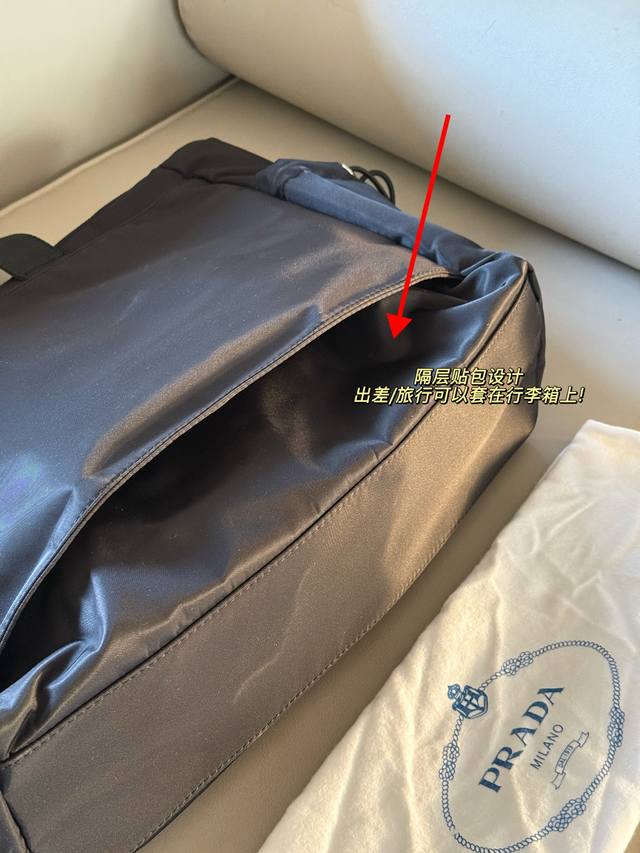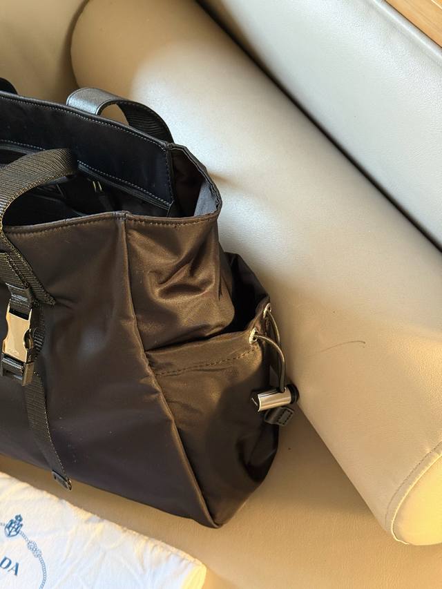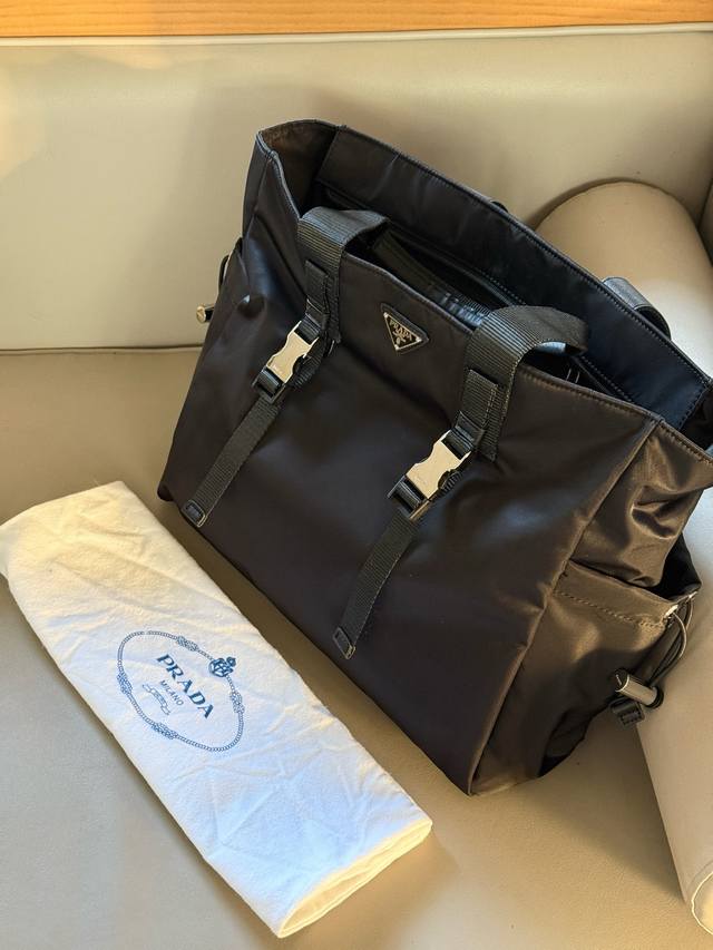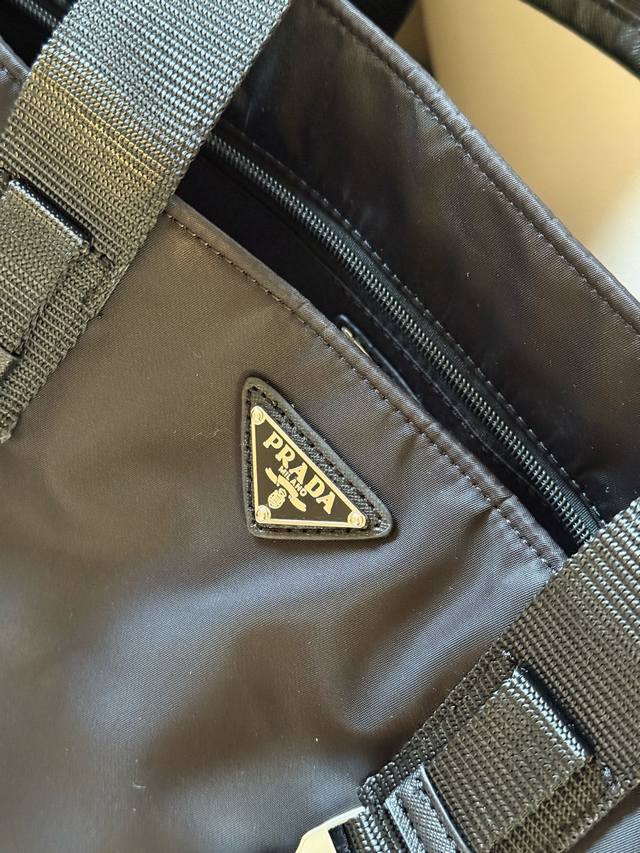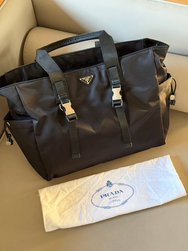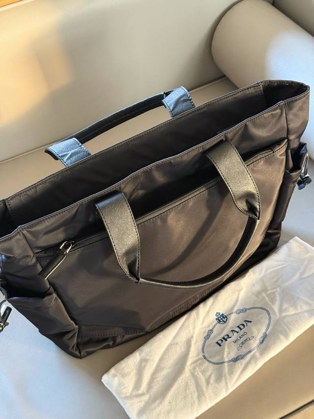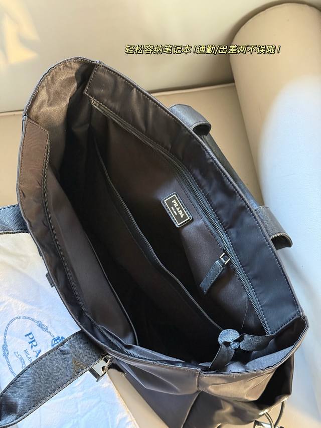 No box. Size: 40*35cm. Prad Tote Shopping Bag. Thick, high-quality leather. It has compartments, a slip pocket, and can be hung on your suitcase! Truly practical!!