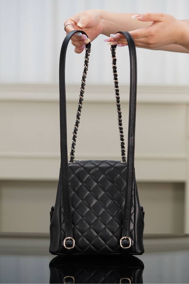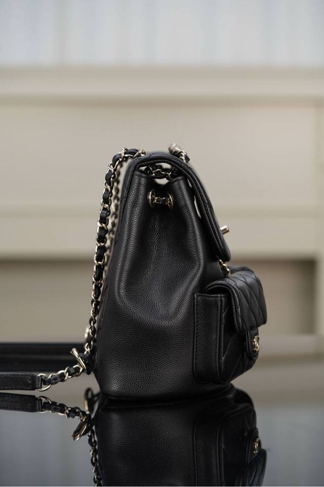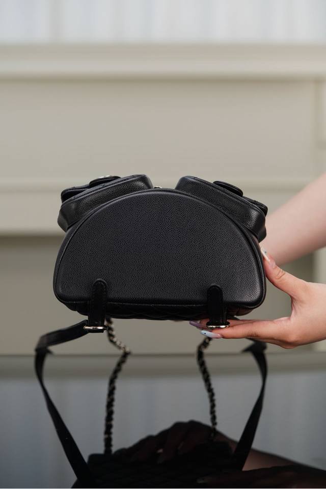 Original Chip Version 23P New Duma Backpack, Medium Size, Black, Leather. This season's dark horse! A little "frog" that combines practicality and style! Similar to last season's Duma backpack, the only change is the two smaller front lower pockets. Both its practicality and appearance are irresistible! The capacity is great; it can easily fit everything you need for everyday outings! The most recommended golden size