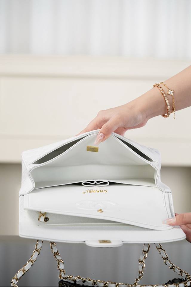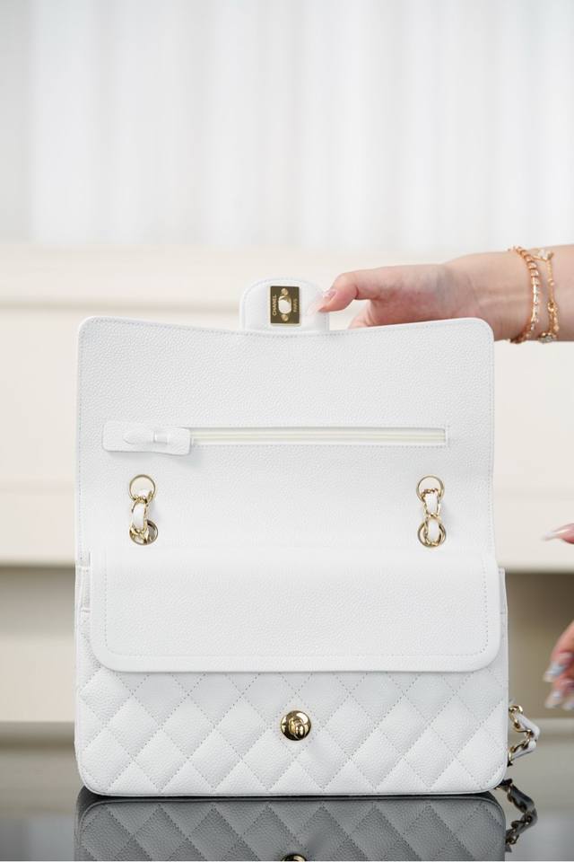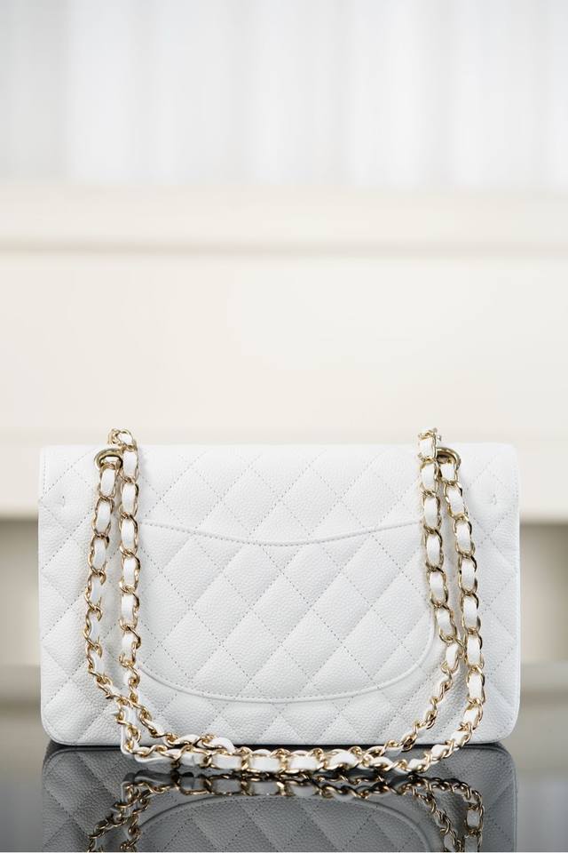 Original chip version classic flap bag, genuine leather, large spherical texture, white gold, medium size. The