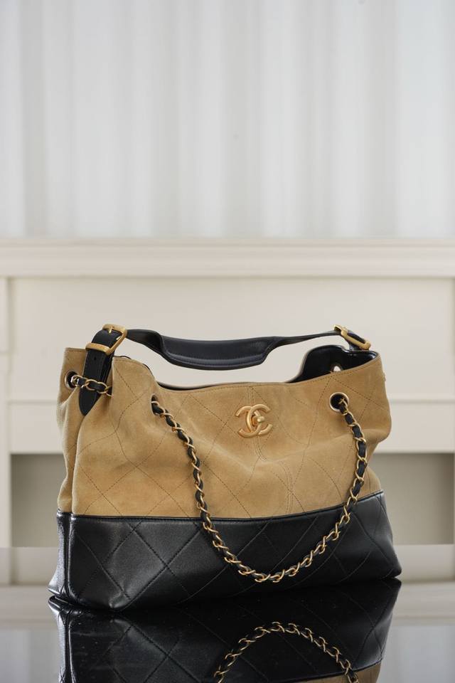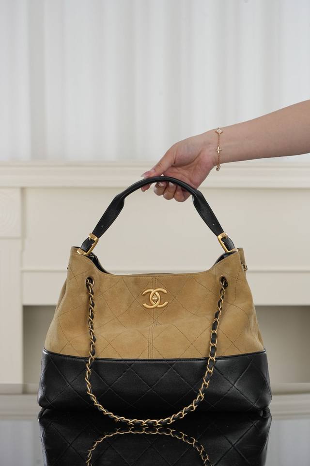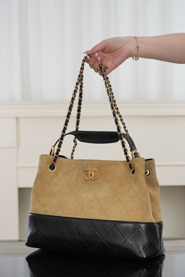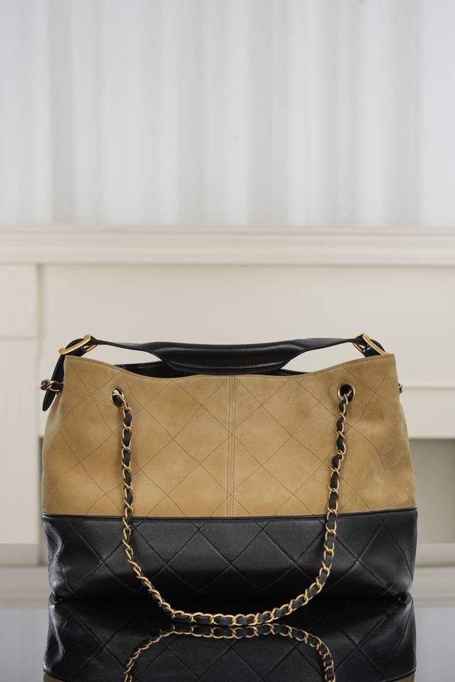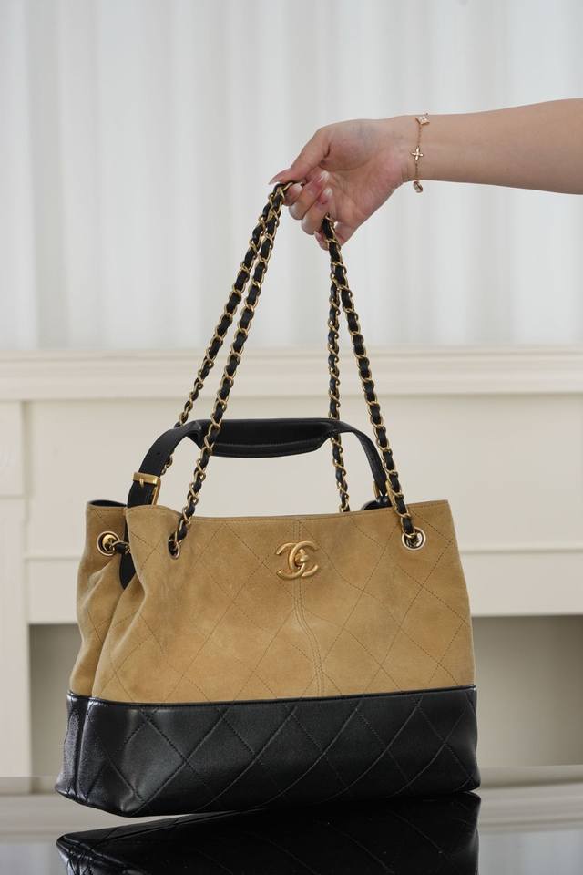 Original Chip Version High-End Handcrafted Suede Shopping Bag, Apricot Small Size. A highlight of the Hangzhou fashion show, this masterpiece blends classic and innovative design, inspired by Coco Chanel's ebony lacquered screen. The iconic diamond quilting meets unique color blocking, and the collision of materials exudes luxury. The bag is large with a super-wide opening! It's spacious yet not bulky, and the color scheme has a retro filter