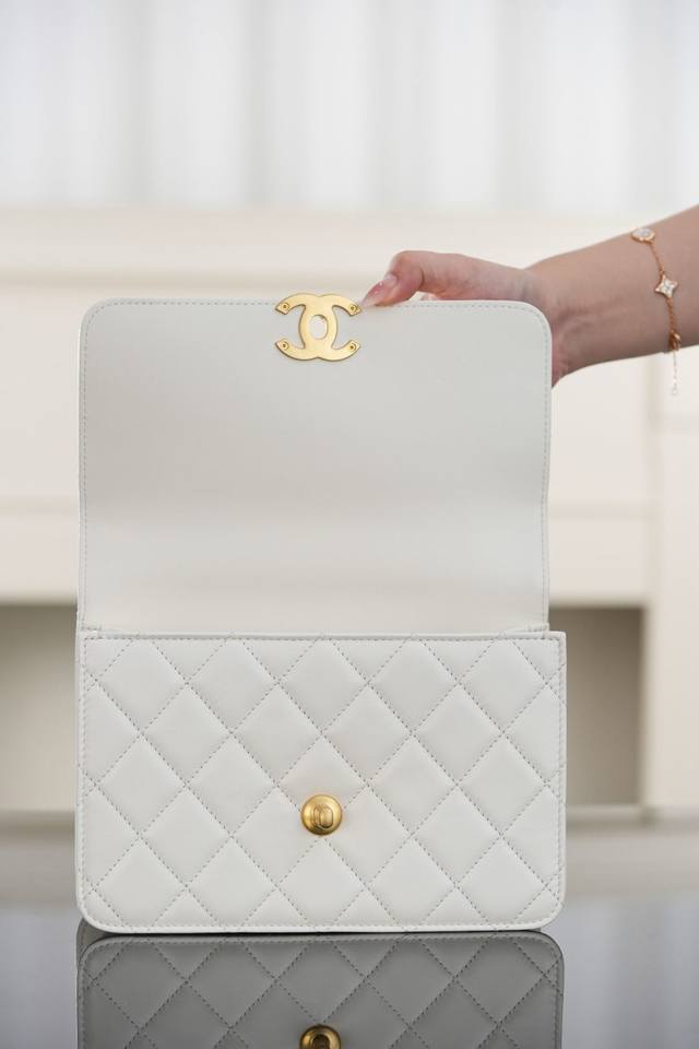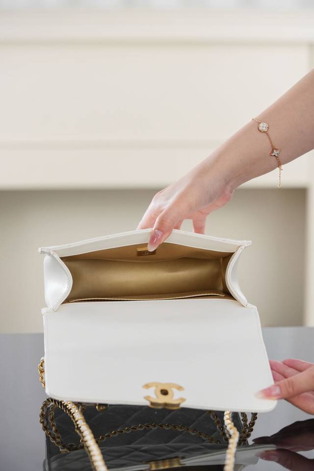 . Made in France, this original smooth calfskin leather bag has a delicate feel and a glossy finish. The distressed hardware paired with the newly upgraded gold lining continues Chanel's consistent aesthetic and practicality , balancing strength and elegance in its design principles. Every detail exudes sophistication; understated yet high-end
