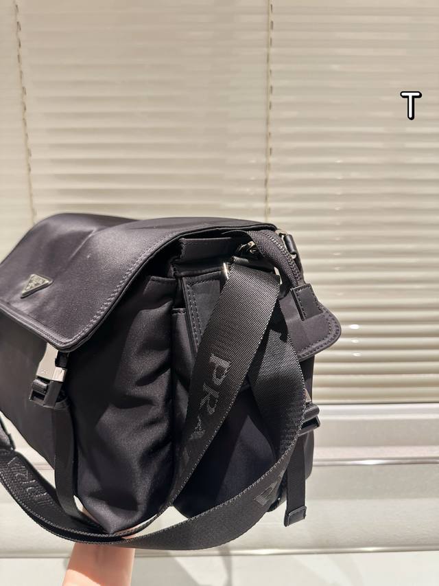 Original Fabric Prada Explore Series Recycled Nylon Messenger Bag. Made with Re-Nylon and black leather, this Prada Explore messenger bag is both eco-friendly and durable! The bag features a simple design with a highly recognizable black and silver enamel triangle logo. The adjustable shoulder strap allows for both shoulder and crossbody wear. It's spacious enough to easily hold a 13-inch laptop and everyday essentials, making it suitable for commuting and travel. Understated and versatile, it suits both men and women, combining practicality and style
