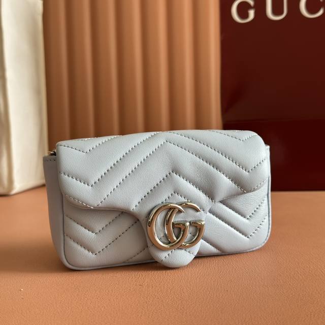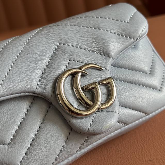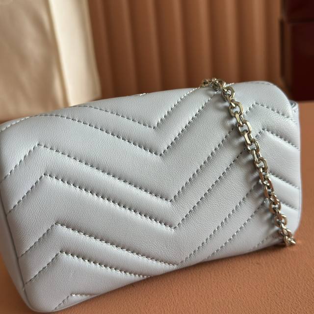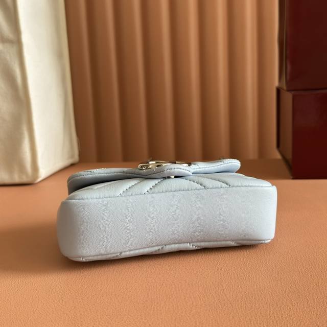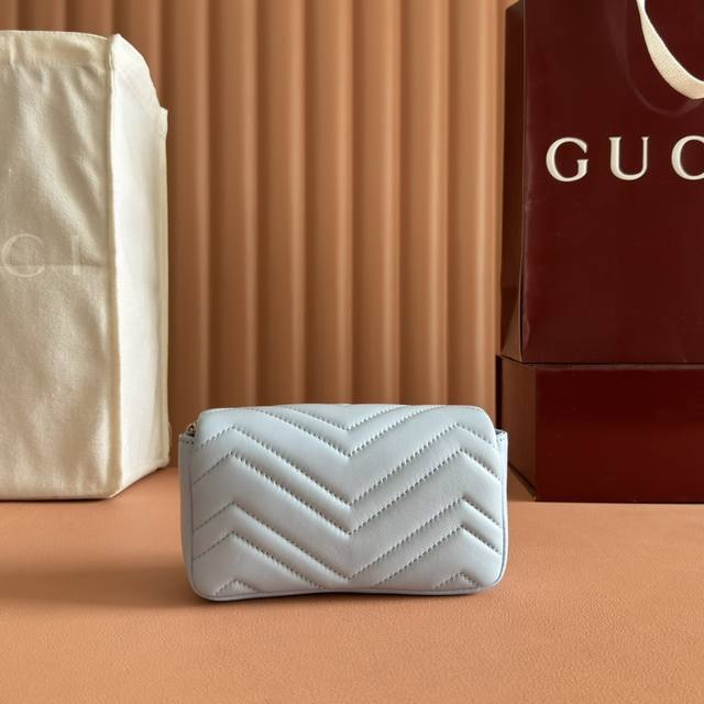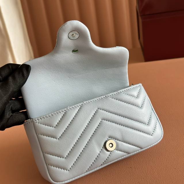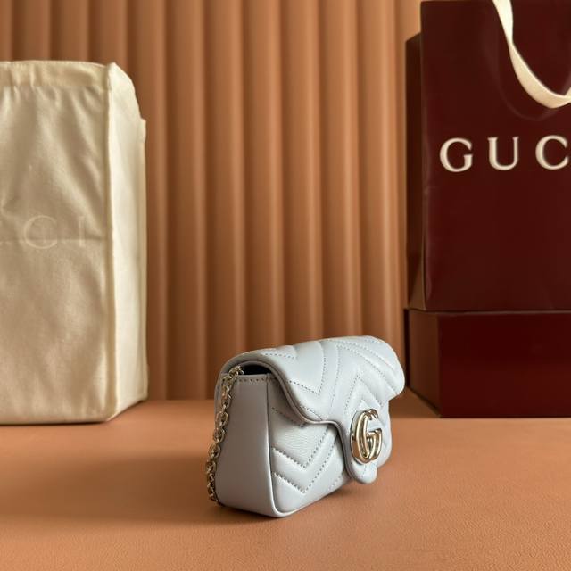 Original leather, complete boutique packaging. The iconic GG Marmont series seamlessly blends double G hardware and a faceted chain strap, crafted from supple leather to create a softly contoured shape. This mini bag is adorned with the brand's archival logo, first introduced in the 1970s. Black V-shaped Matelass