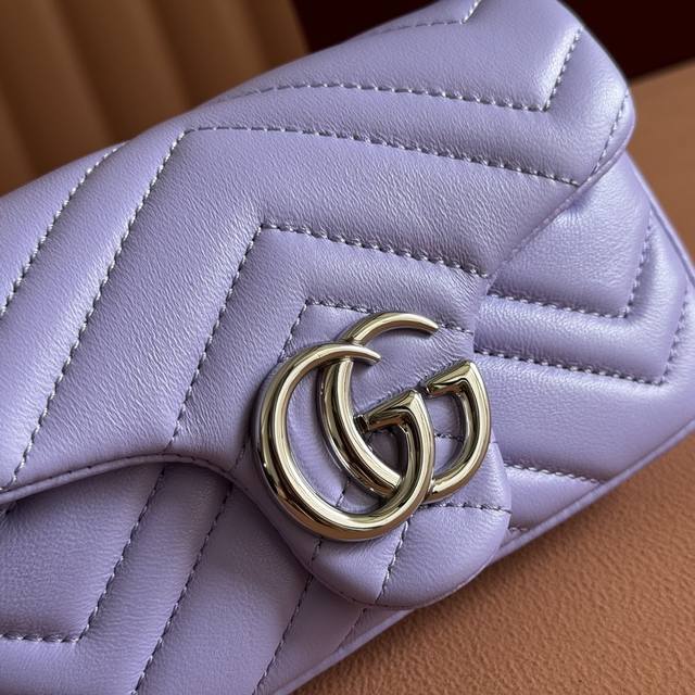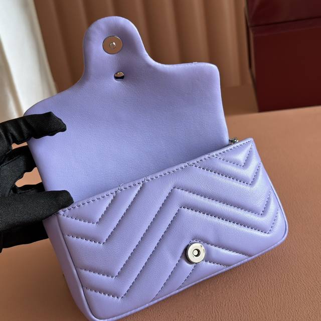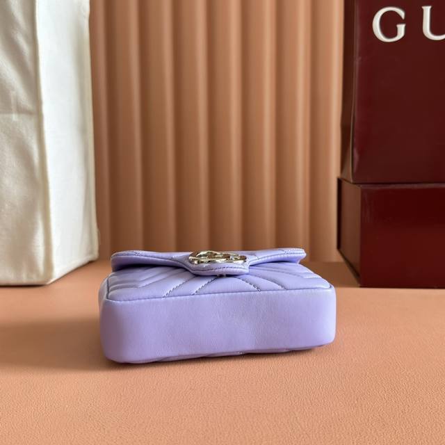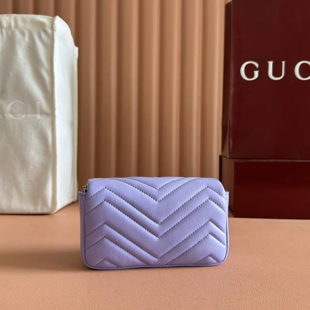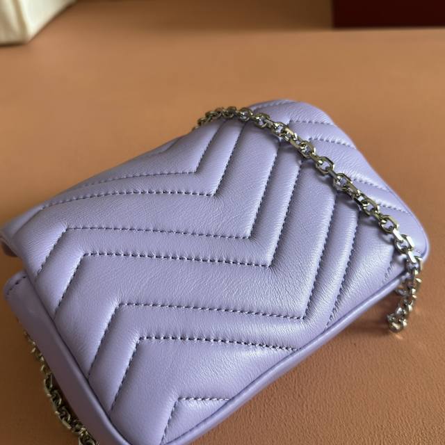 Original leather, complete boutique packaging. The iconic GG Marmont series seamlessly blends double G hardware and a faceted chain strap, crafted from supple leather to create a softly contoured shape. This mini bag is adorned with the brand's archival logo, first introduced in the 1970s. Black V-shaped Matelass