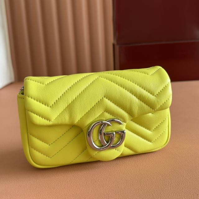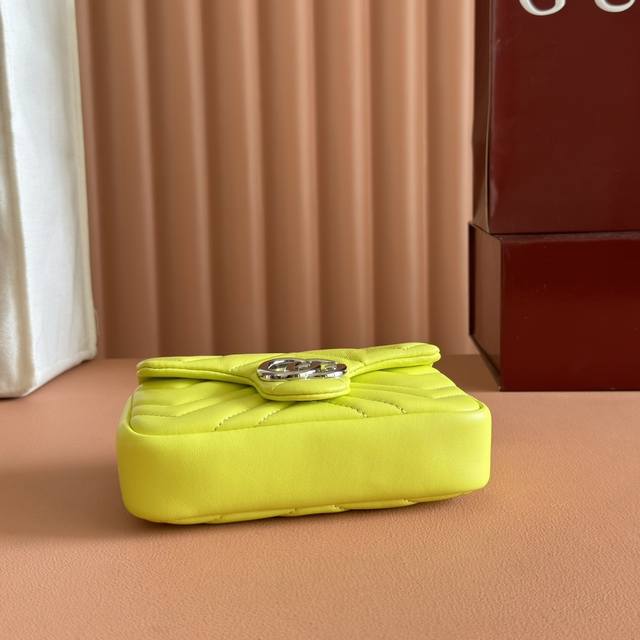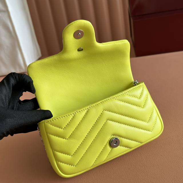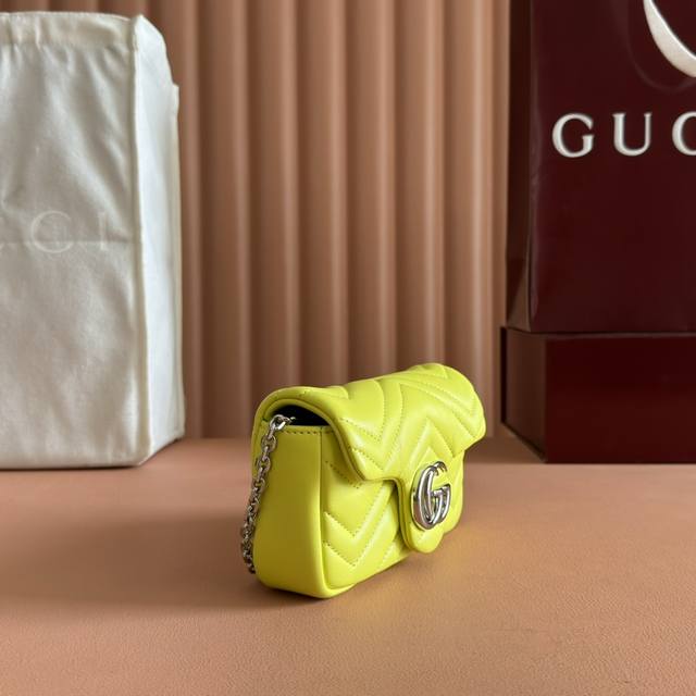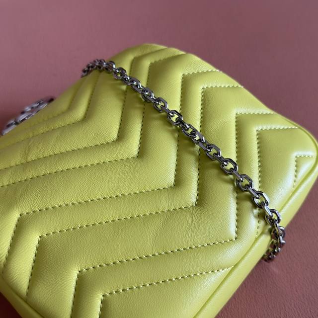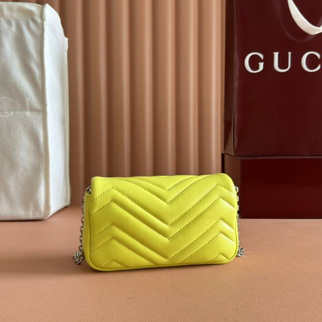 Original leather, complete boutique packaging. The iconic GG Marmont series seamlessly blends double G hardware and a faceted chain strap, crafted from supple leather to create a softly contoured shape. This mini bag is adorned with the brand's archival logo, first introduced in the 1970s. Black V-shaped Matelass