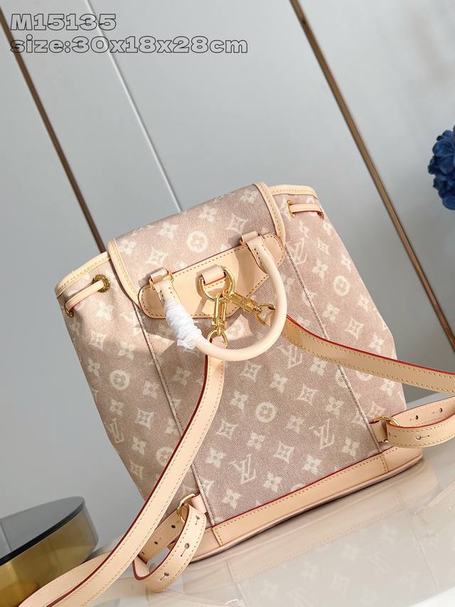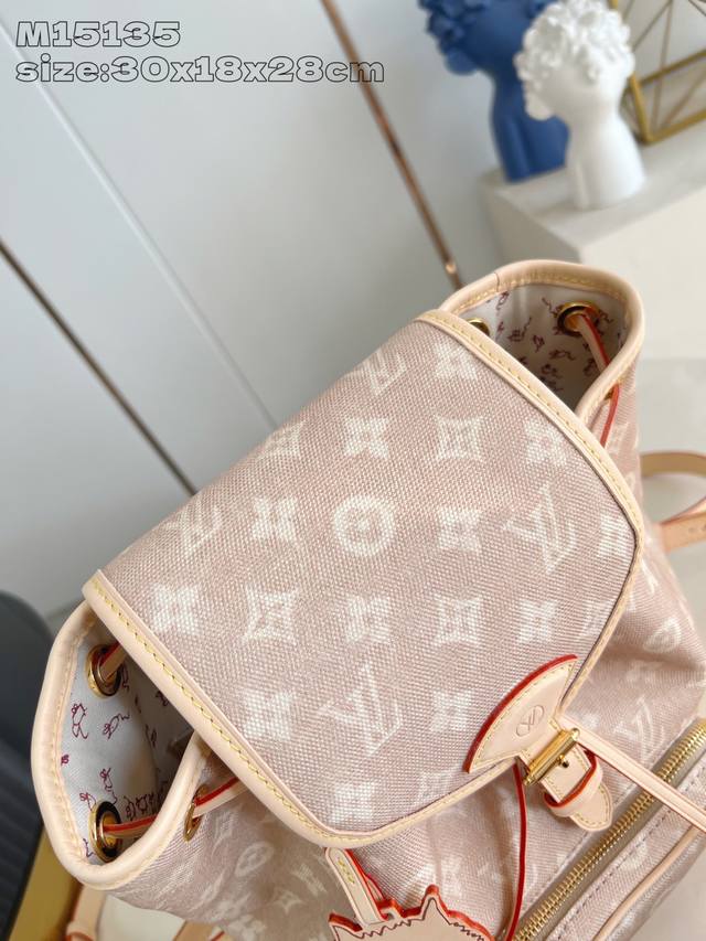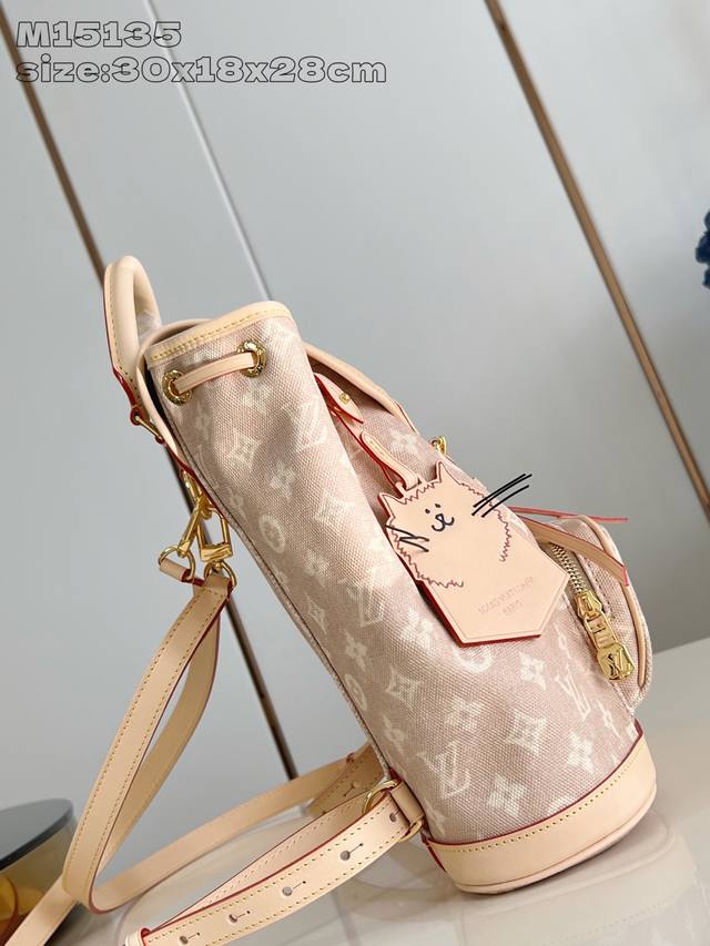 Exclusive Real Shot M15135 This Montsouris small backpack is from the LV Travels With collection, featuring the whimsical Meowgram pattern designed by fashion icon and artist Grace Coddington, showcasing her love for cats. The canvas body includes a detachable cat-shaped key pouch, ample space for everyday essentials, and a short wallet is included. 30 x 18 x 28 cm (H x W x Length)