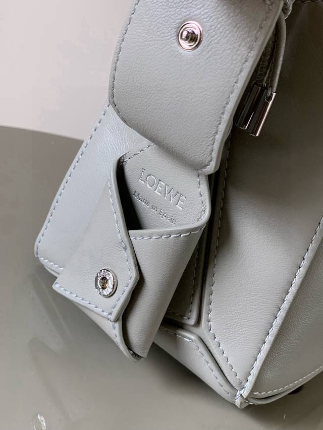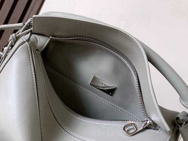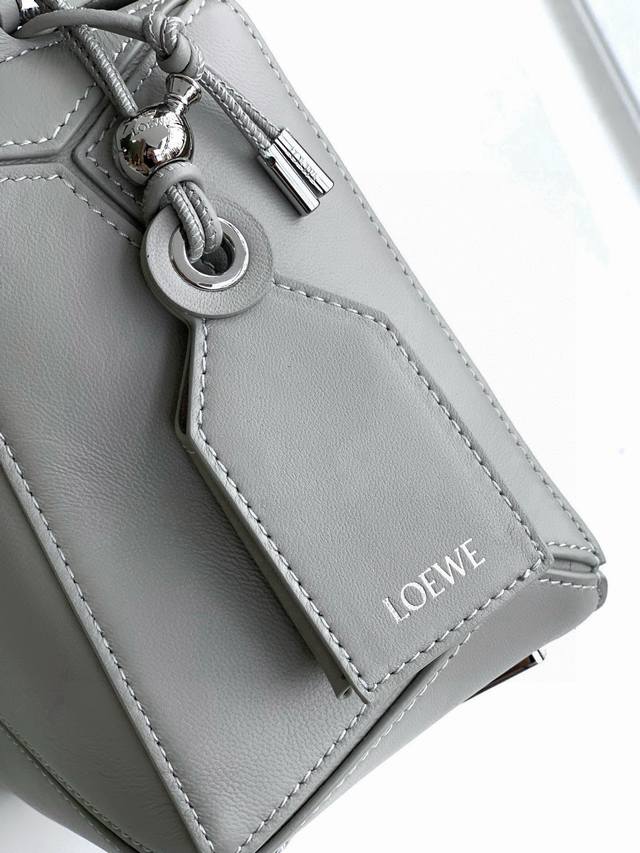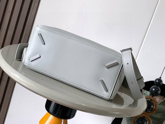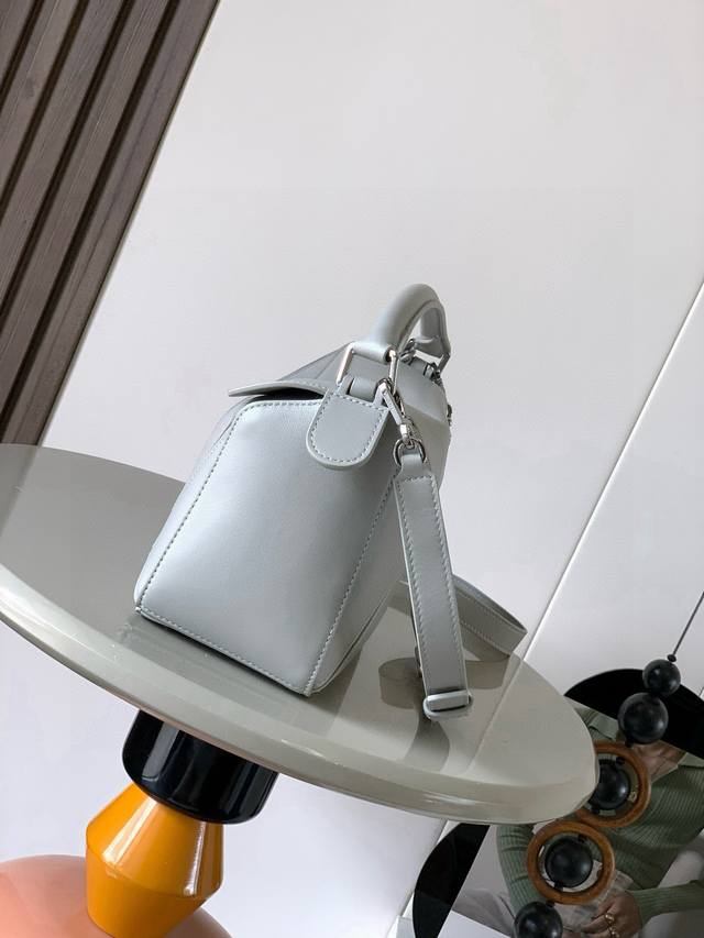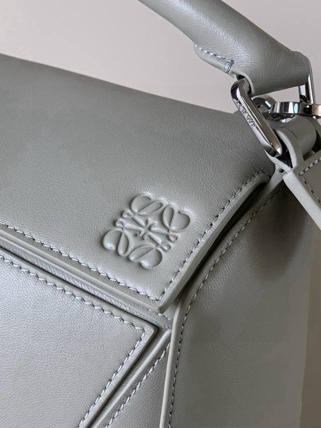 Original Leather Featherlight Puzzle Handbag, New Version Geometric Bag in Small Nappa Calfskin. Made from original imported Nappa calfskin, this bag features a unique geometric design with a rectangular shape. The soft, lightweight Nappa leather gives the bag a relaxed and effortless style. *Can be worn on the shoulder, crossbody, or carried by hand.* Detachable and adjustable shoulder strap with a rotating clasp.* Zipper closure with hinged zipper pull.* One external zippered back pocket and one internal slip pocket.* Detachable, featuring a hidden pocket and balloon dice.* Rectangular metal feet.* This smaller version is made from soft Nappa calfskin.* The small Puzzle can hold, for example, a large wallet, all-size phones, and sunglasses. Can be carried crossbody, shoulder, by hand, or with the top handle.* Detachable.* Color: Space Gray.* Style Number: 9096.* Size: 24cm