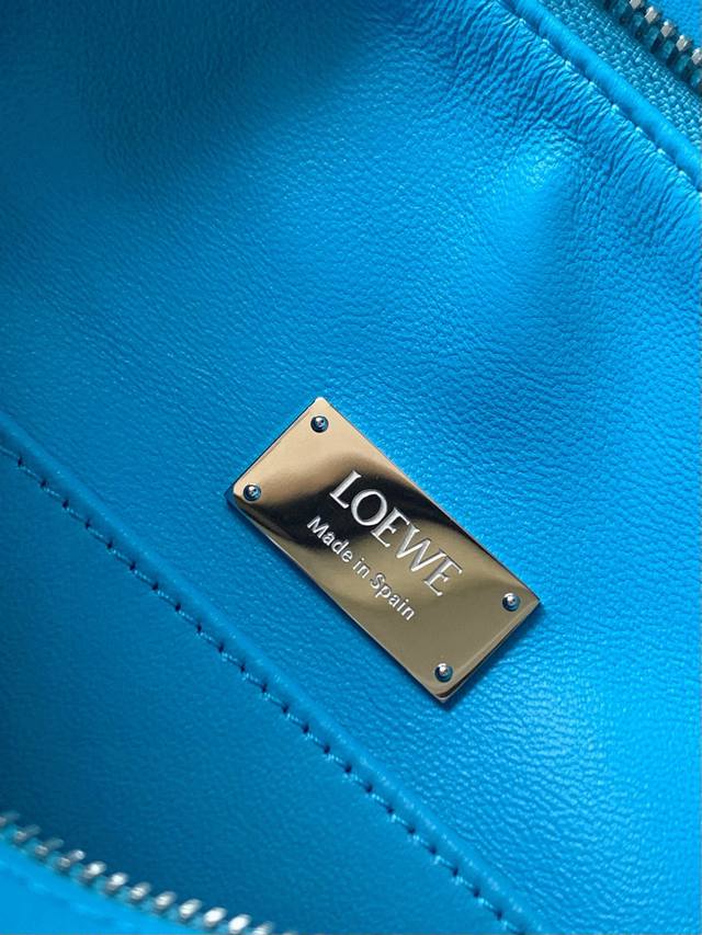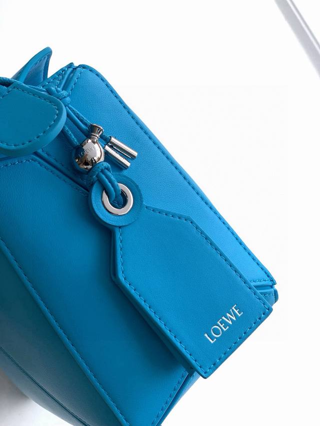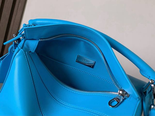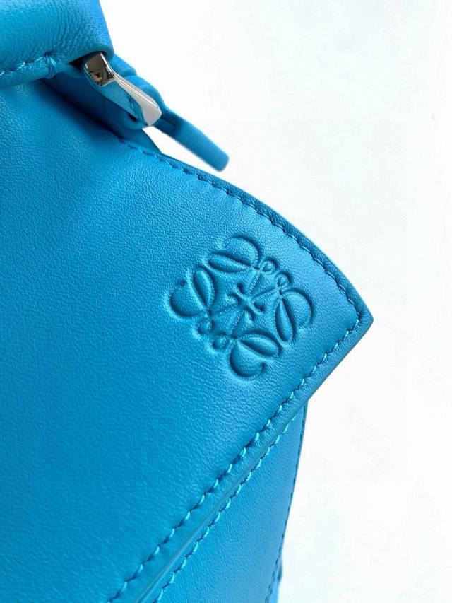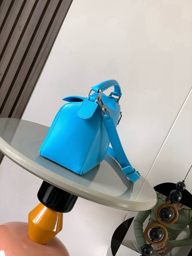 Original Leather Featherlight Puzzle Handbag, New Version Geometric Bag in Small Nappa Calfskin. Made from original imported Nappa calfskin, this bag features a unique geometric design with a rectangular shape. The soft, lightweight Nappa leather gives the bag a relaxed and effortless style. *Can be worn on the shoulder, crossbody, or carried by hand.* Detachable and adjustable shoulder strap with a rotating clasp.* Zipper closure with hinged zipper pull.* One external zippered back pocket and one internal slip pocket.* Detachable, featuring a hidden pocket and balloon dice.* Rectangular metal feet.* This smaller version is crafted from supple Nappa calfskin.* The small Puzzle can hold, for example, a large wallet, all-size phones, and sunglasses. Can be carried crossbody, shoulder, by hand, or with the top handle.* Detachable.* Color: Deep Sea Blue.* Style Number: 9096.* Size: 24cm