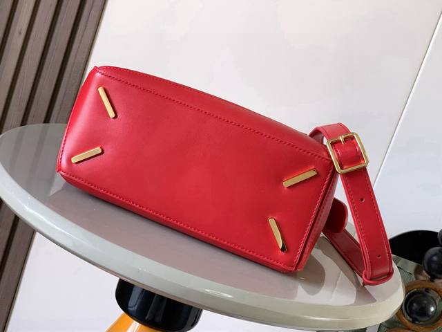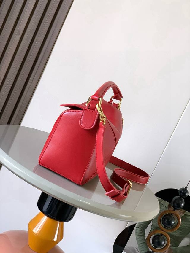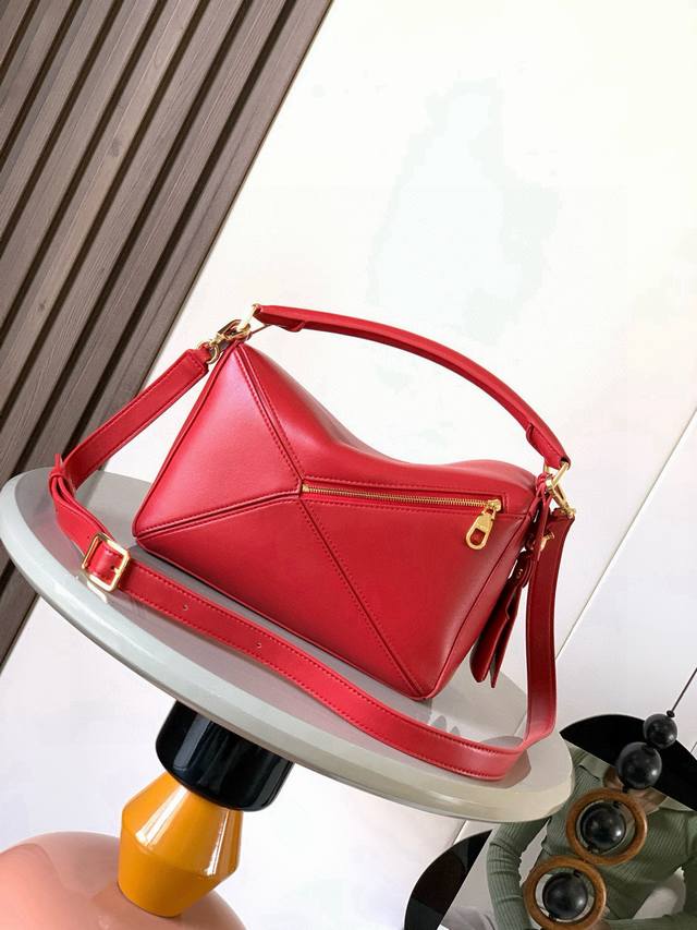 Original Leather Featherlight Puzzle Handbag, New Version Geometric Bag in Small Nappa Calfskin. Made from original imported Nappa calfskin, this bag features a unique geometric design with a rectangular shape. The soft, lightweight Nappa leather gives the bag a relaxed and effortless style. *Can be worn on the shoulder, crossbody, or carried by hand.* Detachable and adjustable shoulder strap with a rotating clasp.* Zipper closure with hinged zipper pull.* One external zippered back pocket and one internal slip pocket.* Detachable, featuring a hidden pocket and balloon dice.* Rectangular metal feet.* This smaller version is made from soft Nappa calfskin.* The small Puzzle can hold, for example, a large wallet, all sizes of mobile phones, and sunglasses. Can be carried crossbody, shoulder, by hand, or with the top handle.* Detachable.* Color: Dark Red.* Style Number: 9096.* Size: 24cm