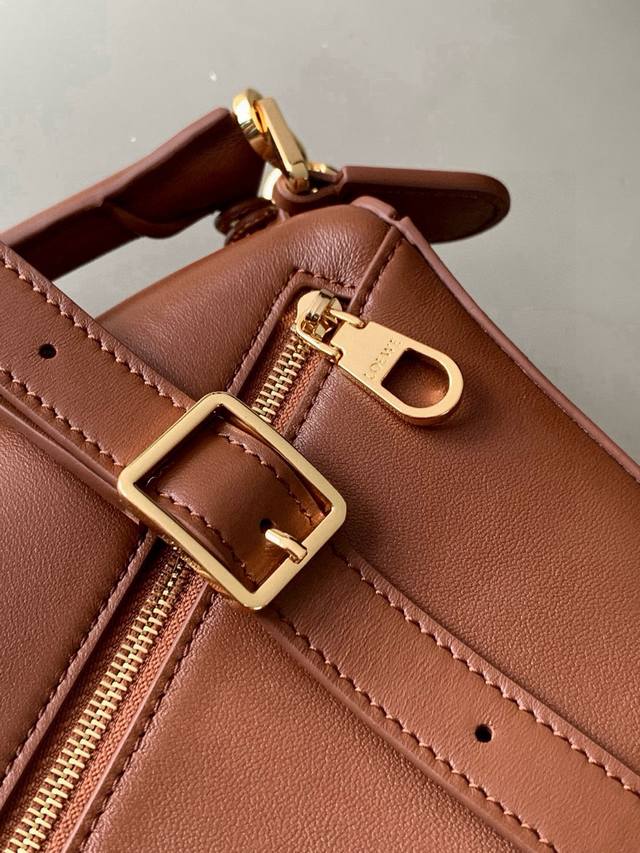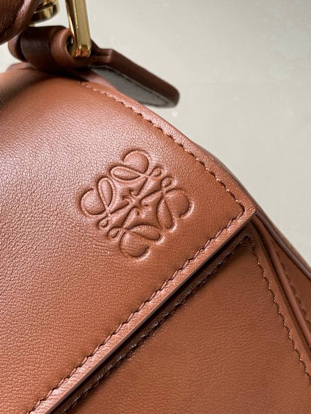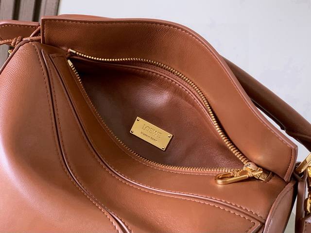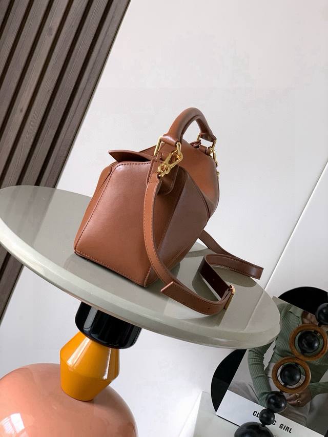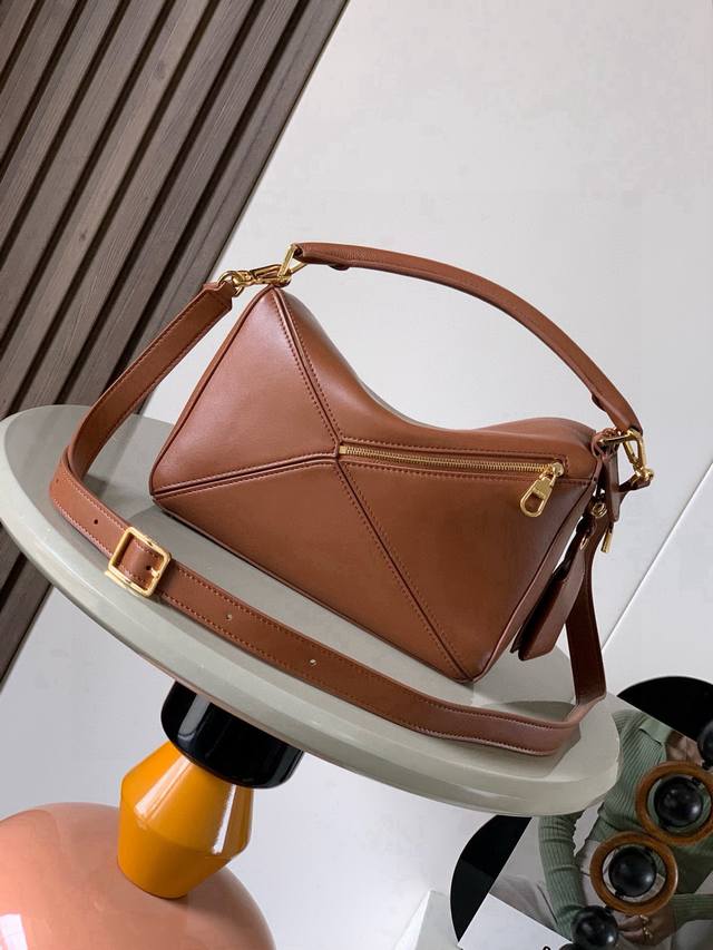Original Leather Featherlight Puzzle Handbag, New Version Geometric Bag in Small Nappa Calfskin. Made from original imported Nappa calfskin, this bag features a unique geometric design with a rectangular shape. The soft, lightweight Nappa leather gives the bag a relaxed and effortless style. *Can be worn on the shoulder, crossbody, or carried by hand.* Detachable and adjustable shoulder strap with a rotating clasp.* Zipper closure with hinged zipper pull.* One external zippered back pocket and one internal slip pocket.* Detachable, featuring a hidden pocket and balloon dice.* Rectangular metal feet.* This smaller version is made from soft Nappa calfskin.* The small Puzzle can hold, for example, a large wallet, all-size phones, and sunglasses. Can be carried crossbody, shoulder, by hand, or with the top handle.* Detachable.* Color: Brown.* Style Number: 9096.* Size: 24cm