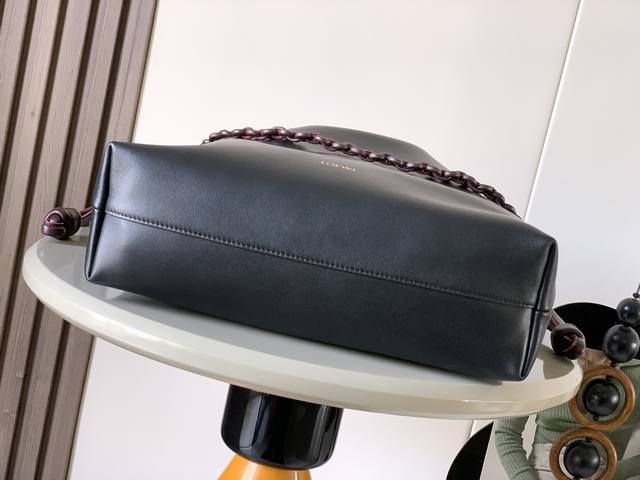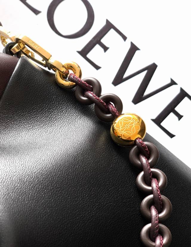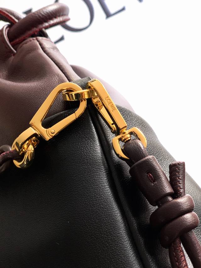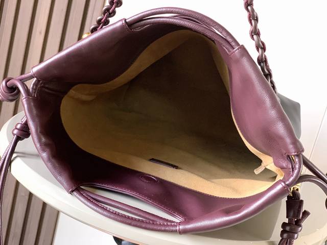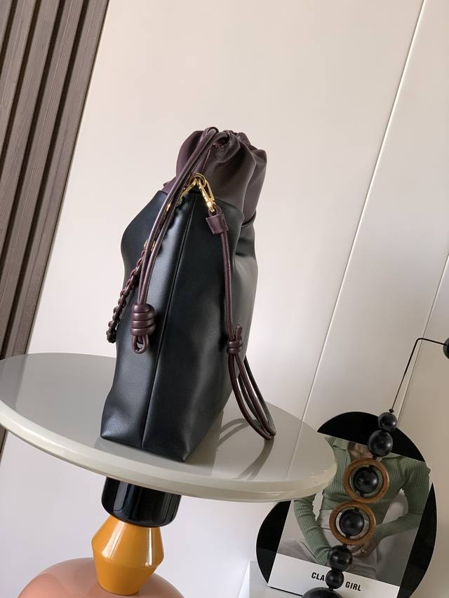 Original Leather Fl?nco Purse Tote Bag - New Soft Two-Tone Nappa Lambskin. This soft and practical bag features a straight design, a historic drawstring, knots, and a tonal donut chain strap that matches the contrasting top. Made of soft Nappa lambskin, this version can be carried on the shoulder, crossbody, or by hand. Features include a top handle, adjustable and detachable leather shoulder strap, detachable donut chain strap, Anagram Pebble magnetic closure, and suede lining. Dimensions: 38-29-9cm. Style Number: 9101. Color: Burgundy Red.