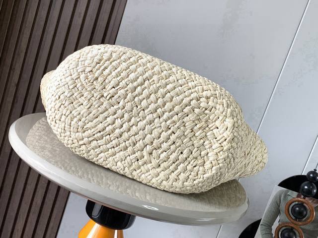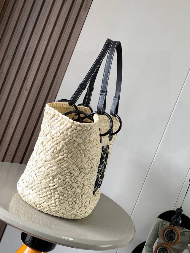 Large Illacca Palm Fiber and Cowhide Anagram Basket Handbag. A classic basket handbag with a classic hand-woven body, tubular cowhide leather strap, and a cowhide Anagram embossed patch. This smaller version is made from Illacca palm, which is grown, harvested, and dried in Colombia, and then woven by female artisans organized by the Corporacion Oficio Y Arte organization, guided by fair trade principles. Due to its handmade nature, the size may vary slightly, making each purchase unique! A must-have woven handbag for summer. If you had to choose one bag as a summer essential, it would definitely be a woven bag. Suitable for everyday wear and weekend outings, it instantly brings out the summer vibe. The Anagram Basket handbag features a classic hand-woven basket design. Effortlessly stylish for a vacation look. A summer essential.