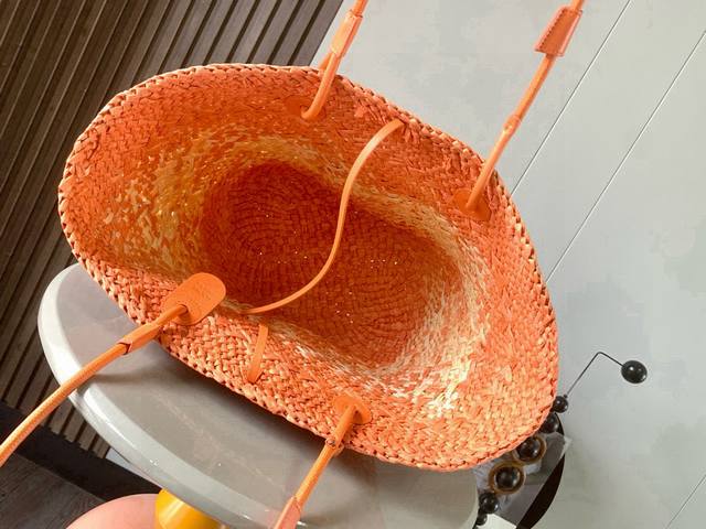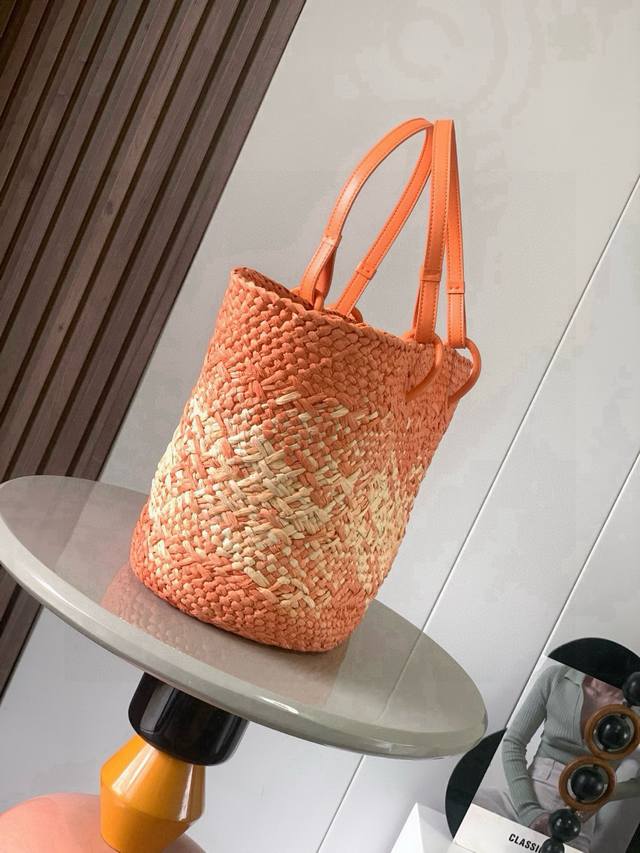 Large Illacca Palm Fiber and Cowhide Anagram Basket Handbag. A classic basket handbag with a classic hand-woven body, tubular cowhide leather strap, and a cowhide Anagram embossed patch. This smaller version is made from Illacca palm, which is grown, harvested, and dried in Colombia, then woven by artisans organized by Corporacion Oficio Y Arte, guided by fair trade principles. Due to its handmade nature, the size may vary slightly, making each purchase unique! A must-have woven handbag for summer. If you had to choose one bag as a summer essential, it would definitely be a woven bag. It's suitable for everyday wear and weekend outings, instantly elevating the summer vibe. The Anagram Basket handbag features a classic hand-woven basket design. Effortlessly stylish for a vacation look. A summer essential.