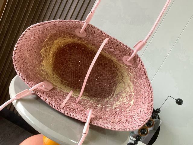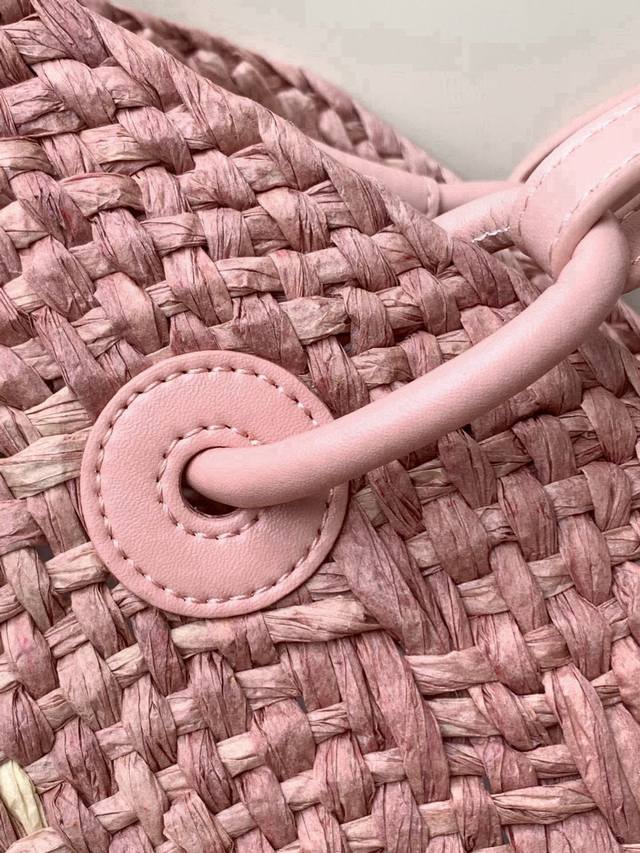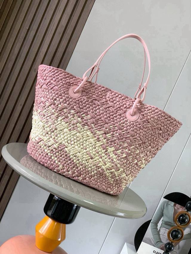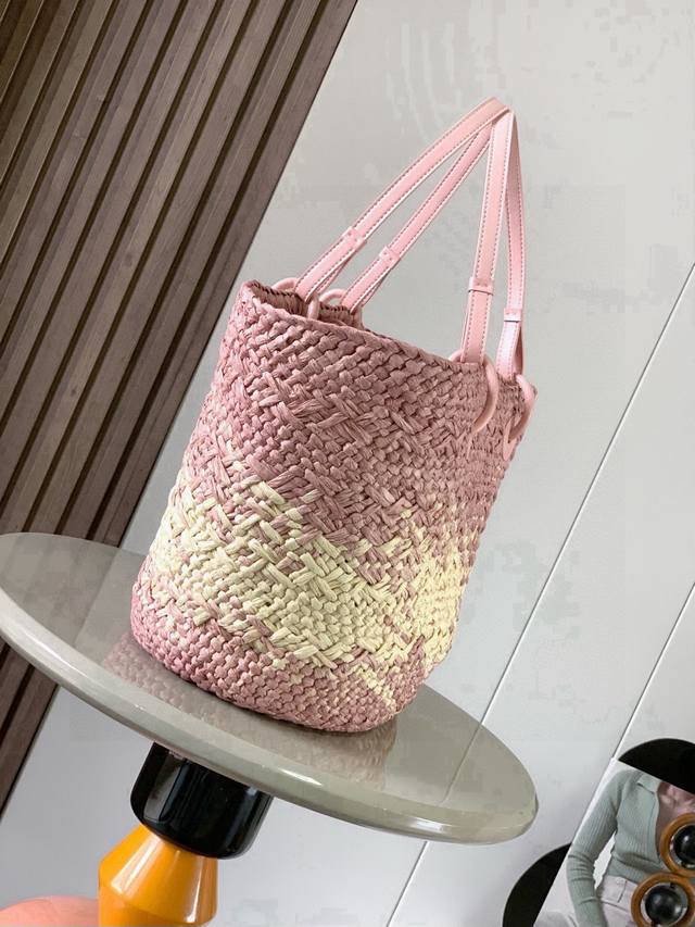 Large Illaka Palm Fiber and Cowhide Anagram Basket Handbag. A classic basket handbag with a classic hand-woven body, tubular cowhide leather strap, and a cowhide Anagram embossed patch. This smaller version is made from Illaka palm, which is grown, harvested, and dried in Colombia, and then woven by artisans organized by Corporacion Oficio Y Arte, guided by fair trade principles. Due to its handmade nature, the size may vary slightly, making each purchase unique! A must-have woven handbag for summer. If you had to choose one bag as a summer essential, it would definitely be a woven bag. It's suitable for everyday wear and weekend outings, instantly elevating the summer vibe. The Anagram Basket handbag features a classic hand-woven basket design. Effortlessly stylish for a vacation look. A summer essential.