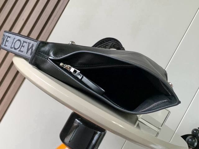 Men's Crossbody Chest Bag, Soft and Smooth Cowhide and Jacquard Fabric. Anton Sling's simple and practical Sling handbag features an adjustable fabric shoulder strap and a zippered top. It can be folded for use and secured with snaps. This version is made of soft and smooth cowhide leather with Loewe jacquard straps. It has two zippered pockets, one on the front and one on the side. The side pockets are perfect for frequently accessed items like your phone and car keys. The design is truly remarkable. * Cowhide zipper pull * Herringbone cotton canvas lining * Anagram embossing