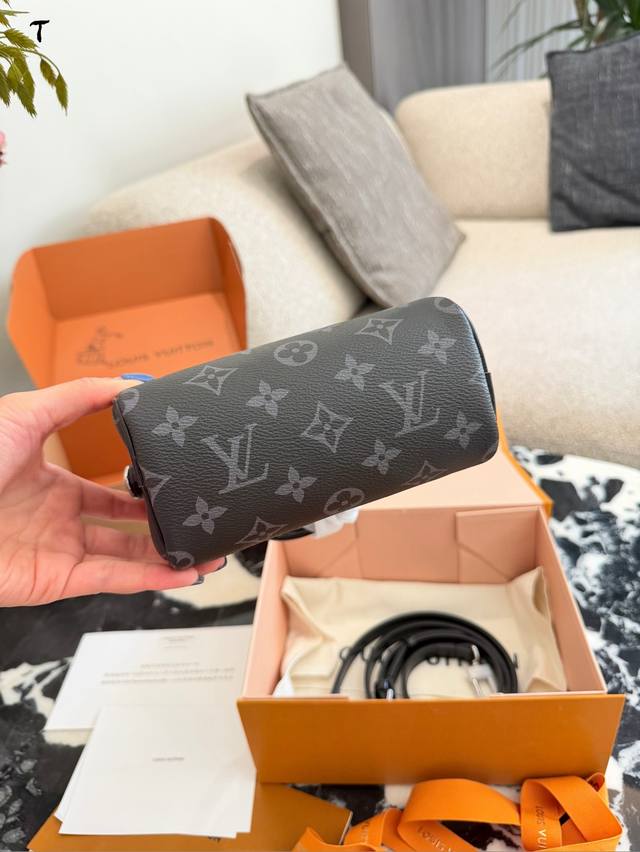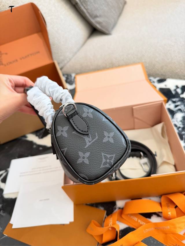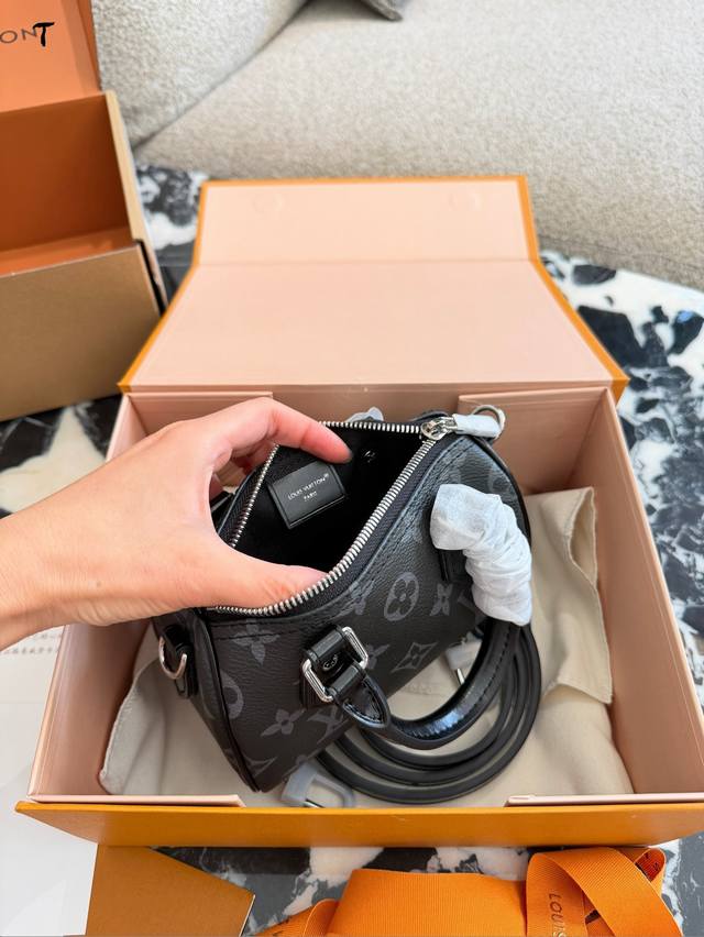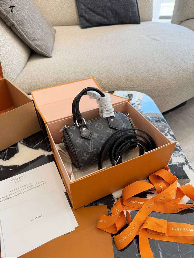 LV Nano Speedy handbag is made of Monogram Eclipse black coated canvas, exuding understated luxury and a cool, edgy vibe. Its compact size makes it easy to carry by hand or crossbody, and the adjustable strap suits women of different heights. While the interior is small, it can still hold everyday essentials, making it a perfect addition to any autumn/winter wardrobe! A classic Speedy series item, practical and stylish, it's a popular LV piece and a must-have for cool girls!