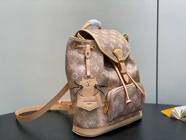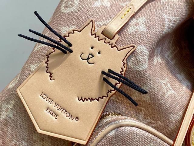 Original Quality M13135 Montsouris Small Cat Backpack. This Montsouris small backpack is from the LV Travels With collection, featuring the whimsical Meowgram pattern designed by fashion icon and artist Grace Coddington, showcasing her love for cats. The canvas body includes a detachable cat-shaped key pouch, ample space for everyday essentials, and a short wallet is included. Dimensions: 30 x 18 x 28 cm (H x W x Length).