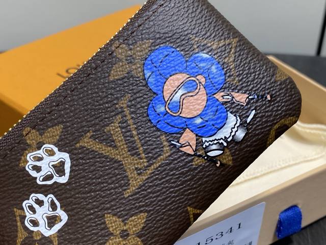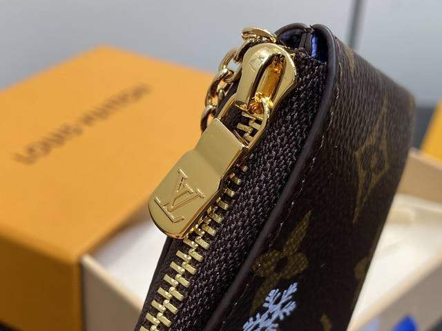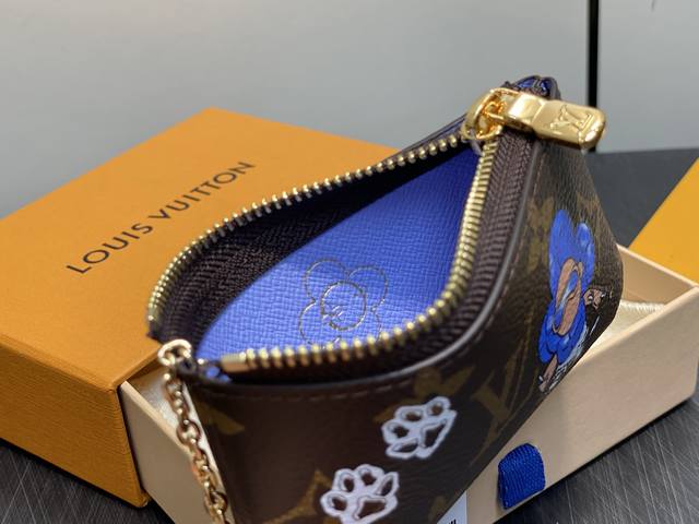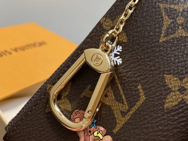 Original Quality M15341 Silkscreen Christmas Monogram Key Pouch Launch. This key pouch reinterprets a classic piece in Vb&N's Winter Travel Collection, showcasing a charming design. Made of signature monogram canvas material. Features an illustration of the house's iconic mascot, Bean, alongside two foot prints. A gold key hook adds a touch of sophisticated style to the compact design. Lined in blue frosted leather. 12 x 7 x 1.5 cm.