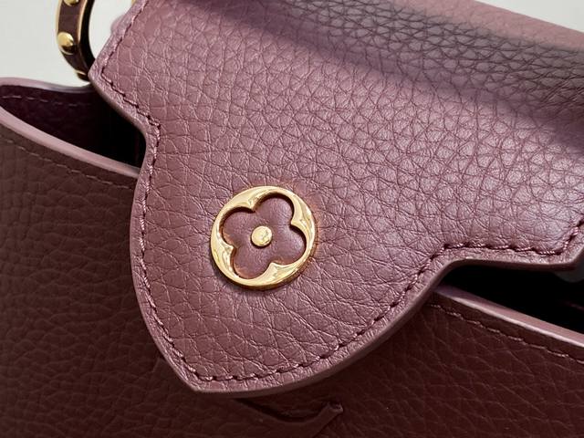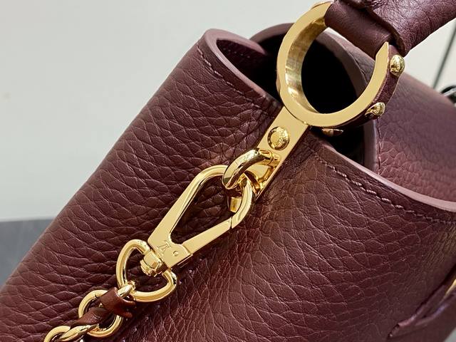 Original Quality M25893 Burgundy Full Leather Capucines Mini Handbag (Na Ying Style) M25893. Inspired by the rich hues of Louis Vuitton's lipstick collection, this Capucines BB is offered in a rich burgundy palette, making it a sophisticated choice from day to night. Crafted from Taurillon leather and adorned with gold-tone hardware, including the iconic LV initials, it features a dual-carry style, allowing it to be worn with either an internal or external flap, and offers an interior compartment to keep valuables organized. Dimensions: 21 x 8 x 13.6 cm (Length x Height x Width).