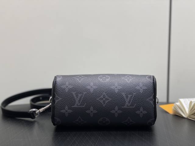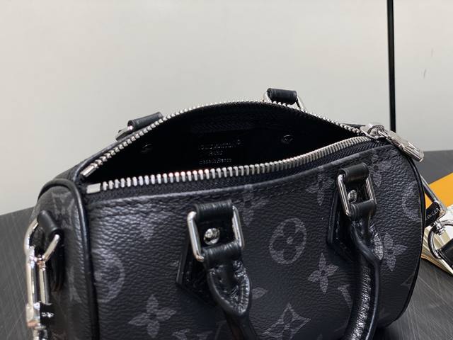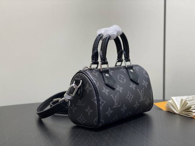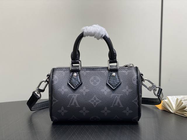 Original Quality M26573 Black Floral Mini Speedy Pillow Bag. This Nano Speedy handbag features a sleek canvas design and an elegant Monogram Edipse pattern, effortlessly brightening your look for day or night. The lustrous metal hardware exudes sophistication, and the ample space can accommodate a small wallet and other everyday essentials. The detachable shoulder strap allows for multiple carrying options. Dimensions: 16 x 10 x 7.5 cm (Length x Height x Width).