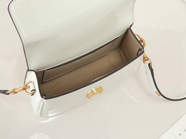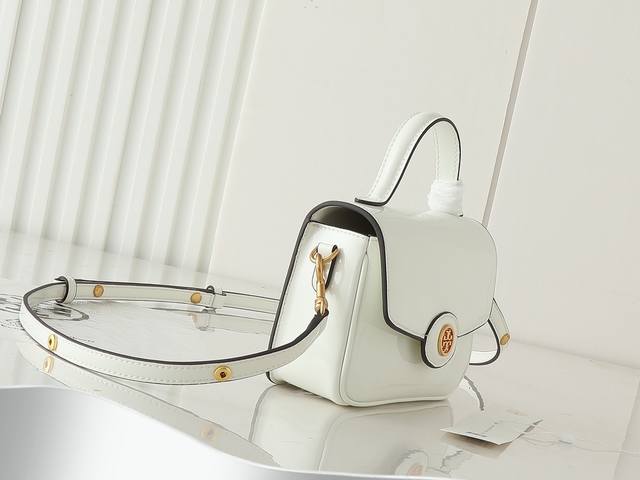 Original quality, new tofu bag series, new product details to note: Tory Burch's new patent leather Robinson series motorcycle bag, a classic and versatile style suitable for everyday use. Made of glossy patent leather with smooth, rounded edges, suede lining, brass hardware, and a magnetic snap closure on the flap. Can be carried by hand, over the shoulder, or crossbody. 19X14X6Cm.