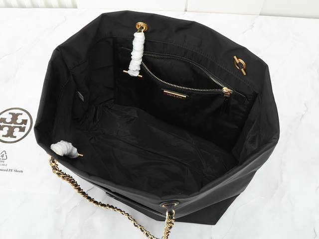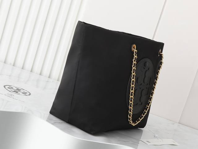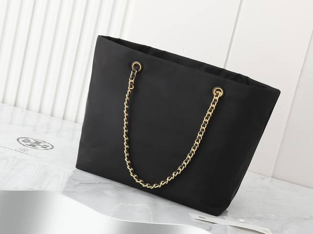 Original quality nylon fabric series, new product, pay attention to details. Tory Burch Ella chain tote bag, softly deconstructed, is uniquely identified by its lightweight recycled nylon material and woven chain shoulder strap. The spacious interior can accommodate everyday essentials, including a laptop, making it ideal for both daily use and travel. Dimensions: 29cm*32cm*16cm. Comes with hangtag sticker, counterfeit label, plastic bag, and branded paper.