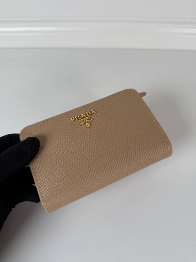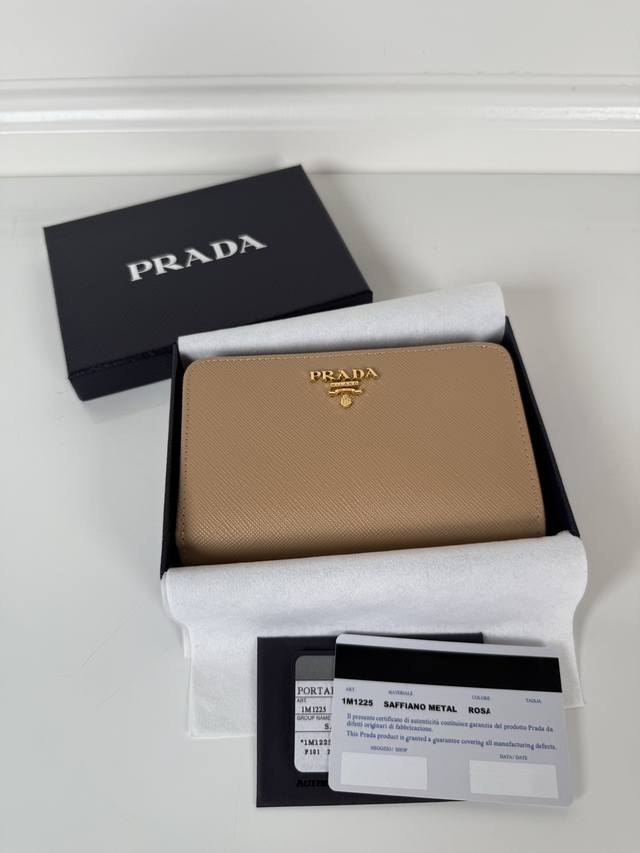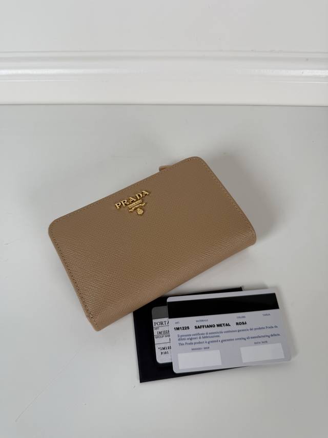 P brand women's cross-grain short wallet, original quality, model 1M1225, ten card slots, two ID pockets, one zippered coin pocket, dimensions 14 x 9.5 cm.