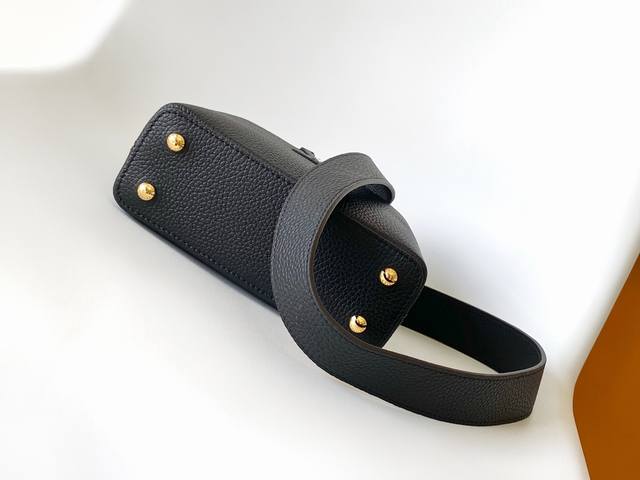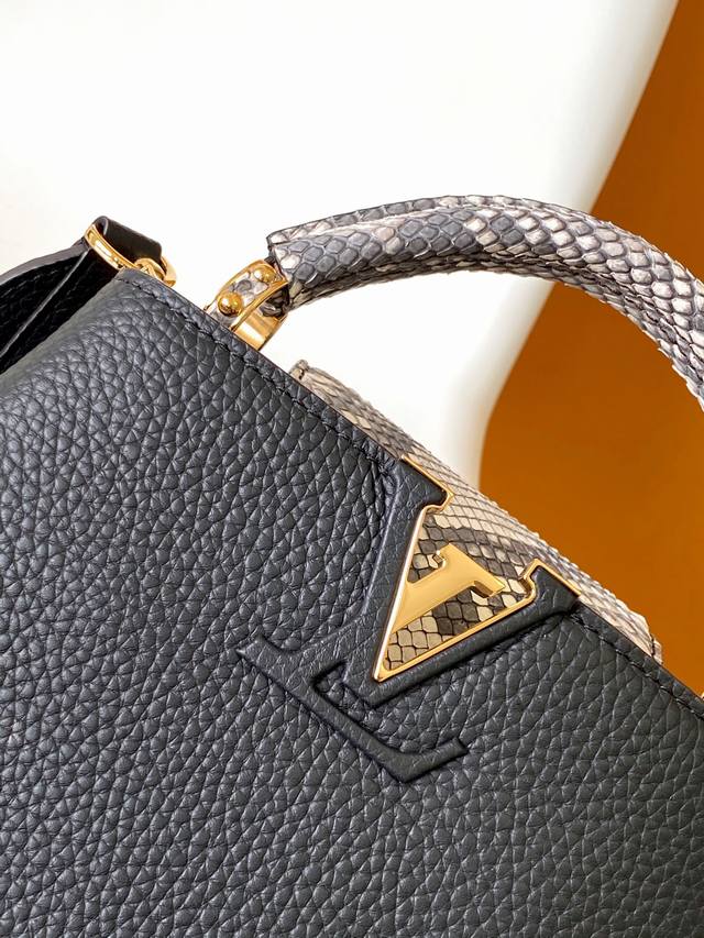 N94755 Gold Buckle with Snakeskin Capucines Handbag Classic and elegant, made of full-grain Taurillon leather, combining exquisite and elegant details, including a moderately firm handle, a gorgeous buckle connecting the handle, and a spacious and practical shape with two interior compartments. Na Ying snakeskin wristband, Na Ying snakeskin wristband full leather women's bag brown Oo [handshake][handshake] Its distinctive flap has two uses: placed outside the bag to show the Monogram flower pattern, placed inside the bag to show the LV initials. Size 27Cm Mini 21