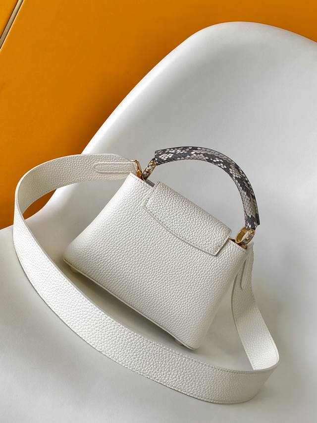 N94755 Gold Buckle with Snakeskin Capucines Handbag Classic and elegant, made of full-grain Taurillon leather, combining exquisite and elegant details, including a moderately firm handle, a gorgeous buckle connecting the handle, and a spacious and practical shape with two interior compartments. Na Ying snakeskin wristband, Na Ying snakeskin wristband full leather women's bag brown Oo [handshake][handshake] Its distinctive flap has two uses: placed outside the bag to show the Monogram flower pattern, placed inside the bag to show the LV initials. Size 27Cm Mini 21