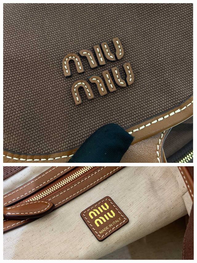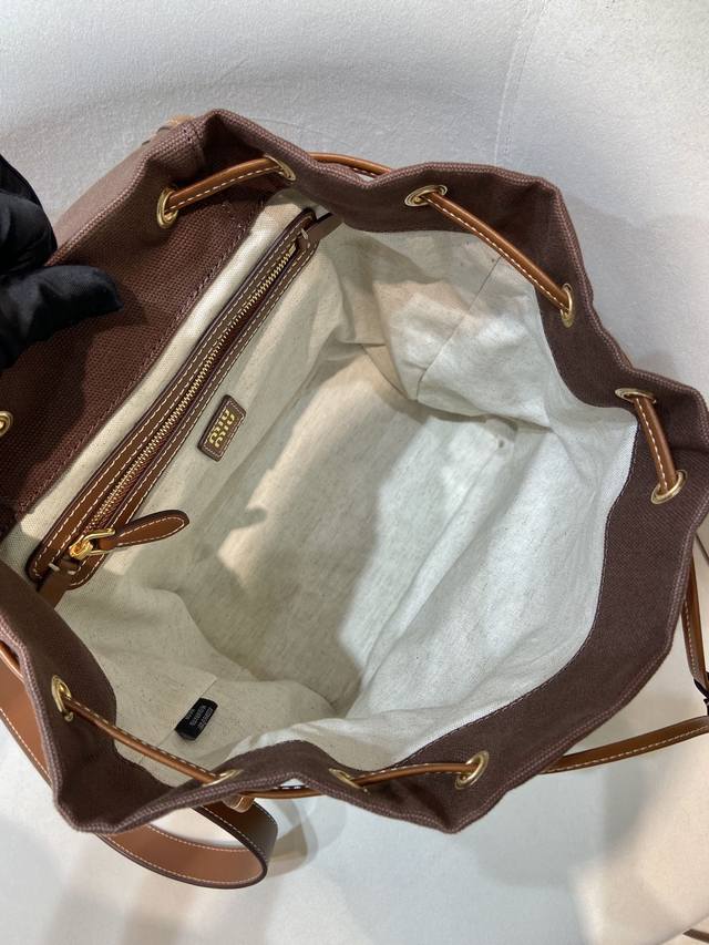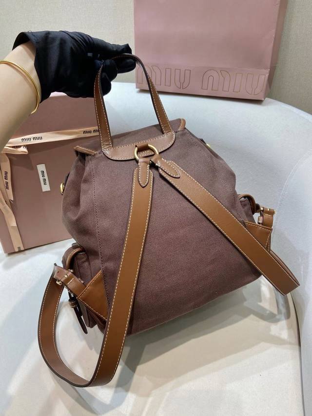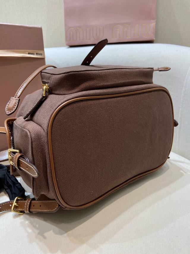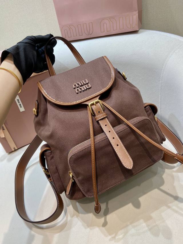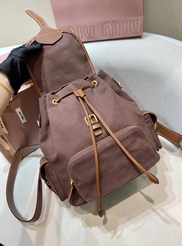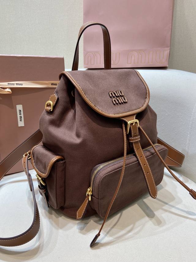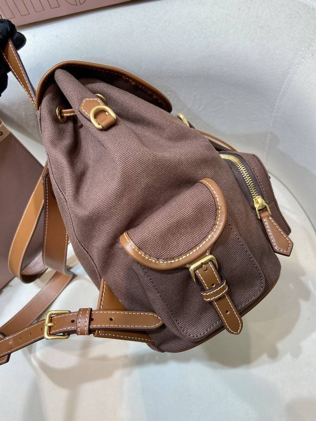 . This canvas and leather backpack is inspired by school uniforms, evoking childhood memories while blending exquisite and practical aesthetics. Its unique multi-pocket design embodies the contemporary playful spirit of the M handbag. Features include leather handles, a front zip pocket, side flap pockets, gold-tone hardware, and a snap-on flap closure. Practical and stylish, grab yours now!