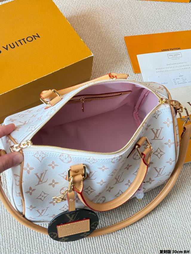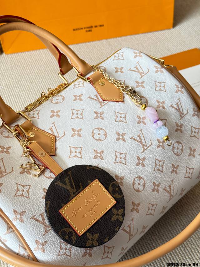Tlv Speedy Soft 30 Dune handbag features classic Monogram coated canvas with a leather lining, offering softness and durability. The gold-tone hardware adds a touch of sophistication. Measuring 30 x 17 x 21 cm, it's a moderately sized bag suitable for commuting, travel, and leisure. Features include a detachable blue boarding pass, a metal hard-sided charm, and a red key pouch charm, making it both practical and stylish. The gentle and versatile Dune color is a must-have for spring and summer outfits. Easily switch between hand-carry, shoulder-carry, and crossbody styles, making it a versatile essential for travel and everyday wear!