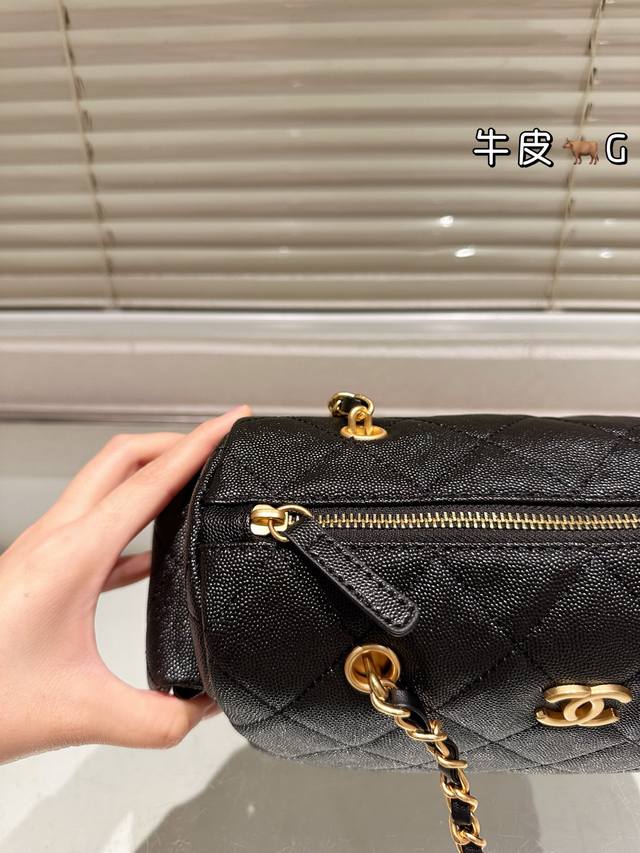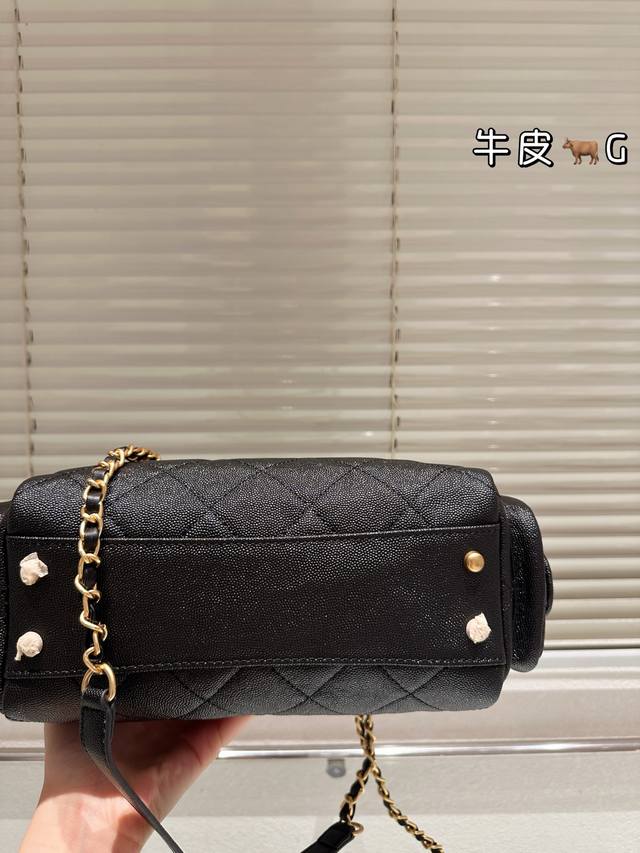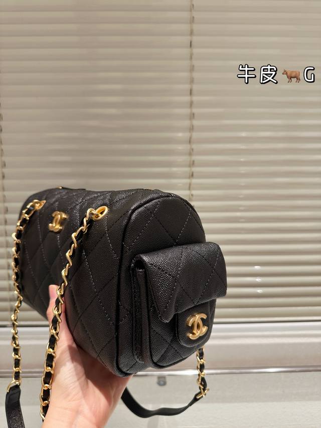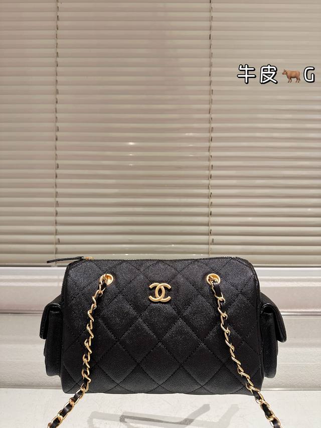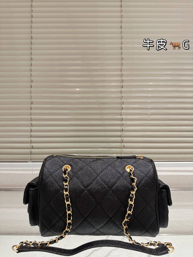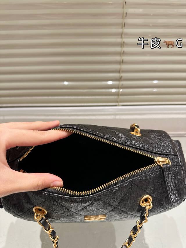 Replica Caviar Pattern Chanel 25K Suede Bowling Bag. This Chanel 25K suede bowling bag features suede cowhide leather with a classic quilted pattern, exuding a retro feel! The gold hardware adds a touch of sophistication. The chain allows for hand-carrying, shoulder-carrying, or crossbody wear, making it versatile and practical. The small size (15.5 x 24 x 11.5 cm) offers just the right amount of space, perfect for commuting. Side pockets enhance storage capacity, easily accommodating even thicker autumn and winter coats. The classic black and gold color scheme is timeless and a top choice for long-term wear enthusiasts