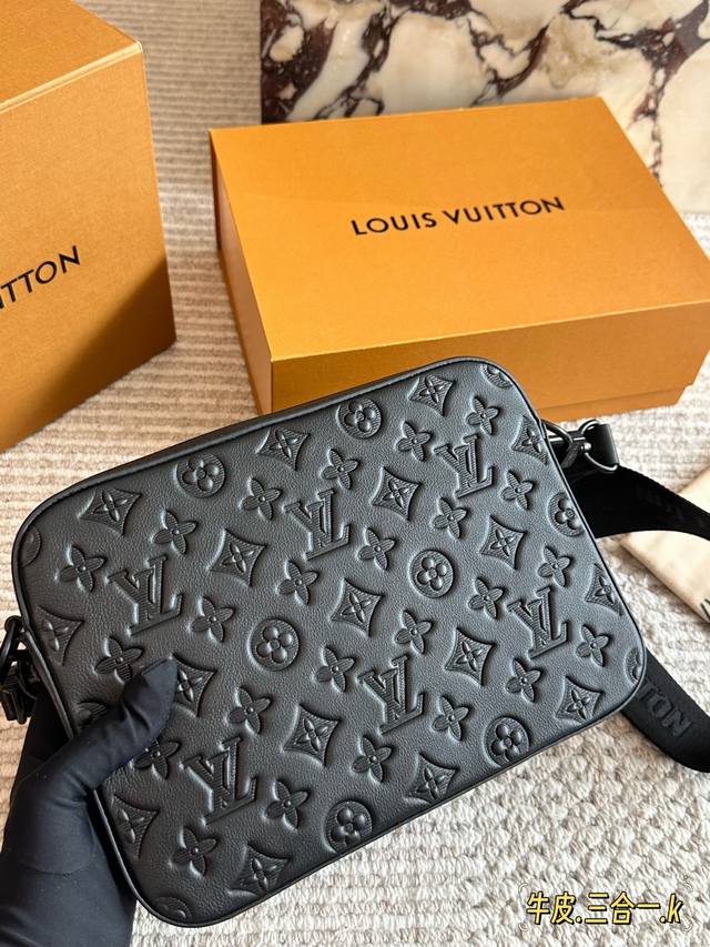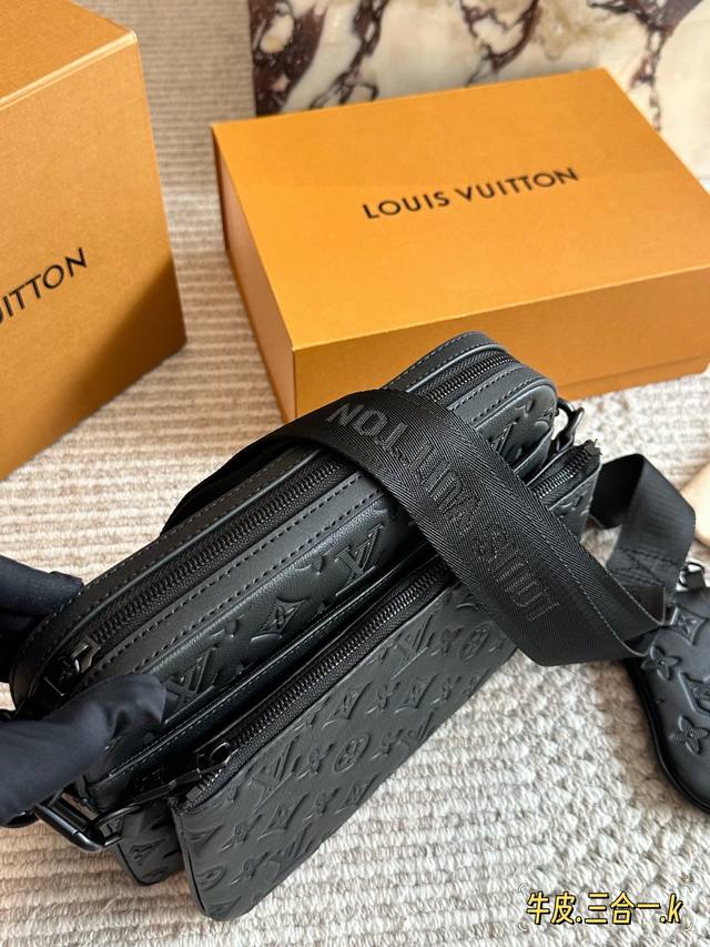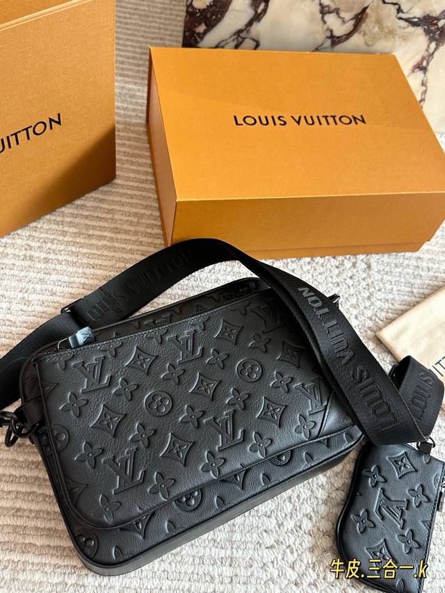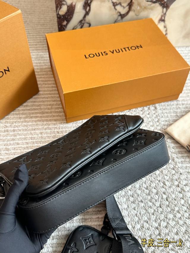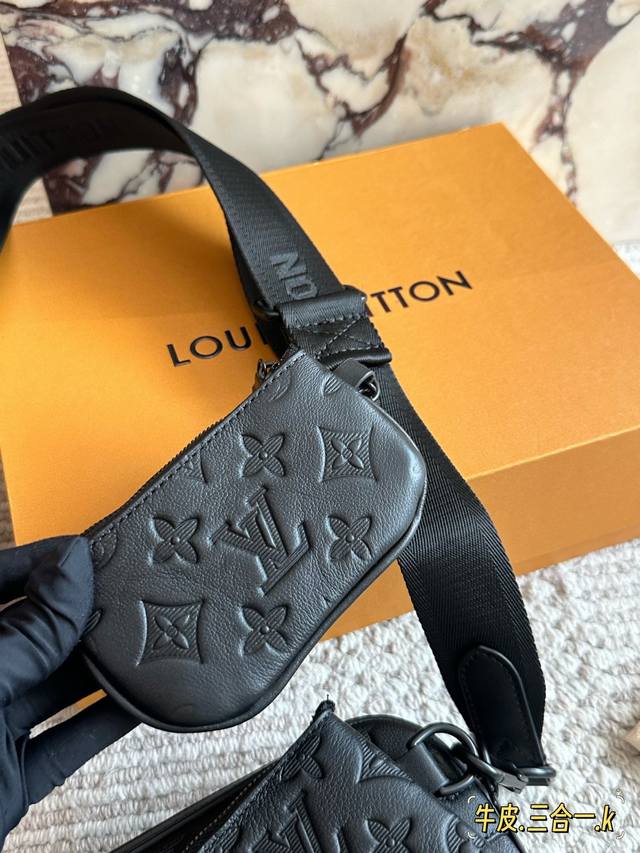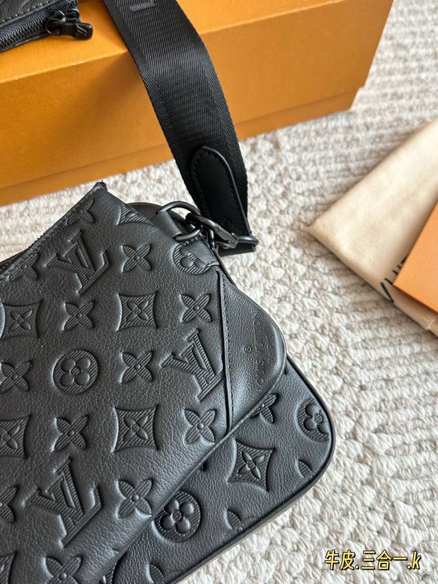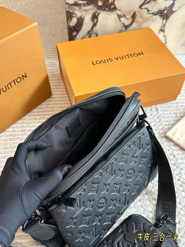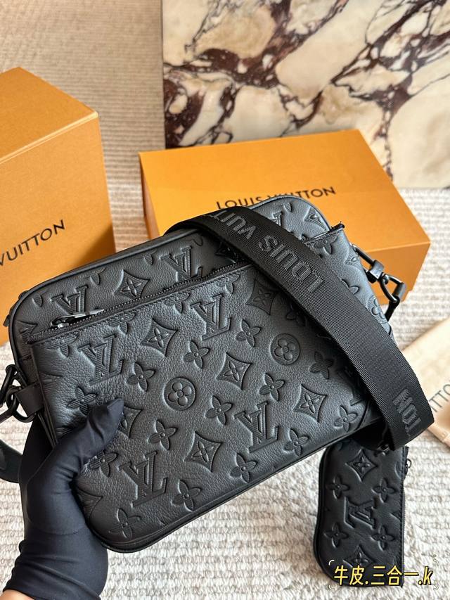 Replica Leather LV Men's Trio Messenger Bag (Three-in-One Black Warrior Style). LV's three-in-one bags have become incredibly popular, sparking a trend for various bag styles. What's truly remarkable is the release of a men's version , featuring a combination of black monogram and contrasting black monogram prints. Black monogram enthusiasts will find it irresistible. Each part of the men's three-in-one bag can be disassembled and combined freely. The bag is slightly larger than the women's version; the largest piece can fit an iPad mini, the medium piece easily accommodates a large iPhone, and the smallest piece is perfect for cards and other small items. The capacity is excellent. Being a men's bag, the overall design is more rugged and stylish, and the black monogram print is very cool. It can be worn by both men and cool women. A black leather triangle is added to the bottom corner of the bag, adding a touch of design flair. 25cm x 18cm